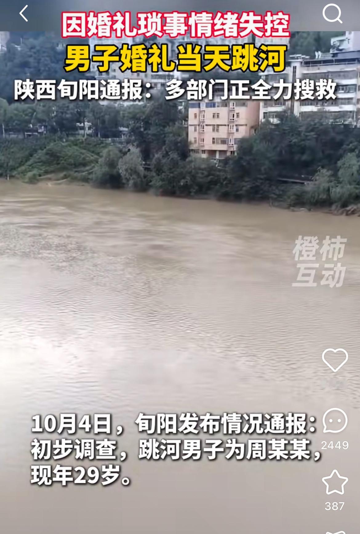 10月3日,陕西旬阳一新郎跳河自杀,知情人透露原因疑似彩礼被临时加价,新郎想不开