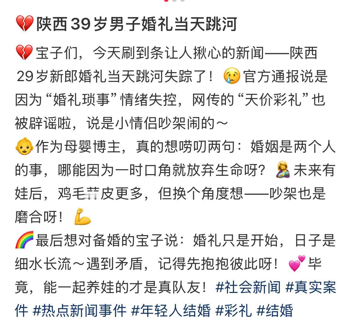 太揪心!太意想不到了! 结婚当天跳河的新郎还没找到,他爸一句话戳得人心慌: 不是彩礼,不是新娘不下车,可到底为啥,连亲爹都说不清。 好好的大喜日子,红嫁衣还没穿热,人就扎进了河里,这哪是解决问题?分明是把难题全扔给了爹妈。 就算结婚前有天大的坎,大不了说句“这婚我不结了”,单身咋了?换个人处又咋了?非要用轻生堵死所有路,想过爸妈后半辈子咋熬吗? 说真的,这不是抗压能力差,是没把“责任”俩字装心里。 活着才有机会翻篇,死了只剩爸妈哭到沙哑。 你们说,要是遇到迈不过的坎,先想想啥才是最该守住的?