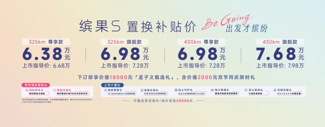 目前购车可享受多项优惠政策,包括置换补贴、充电桩及三电系统终身质保等。63800元拿下孟子义同款缤果S