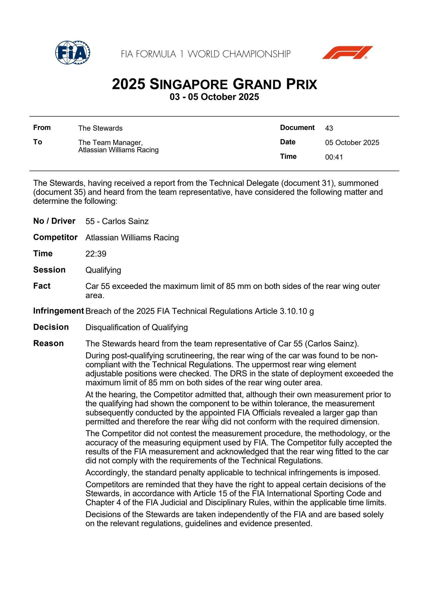 威廉姆斯车队两辆赛车的尾翼未能通过赛后车检,被取消排位赛成绩!