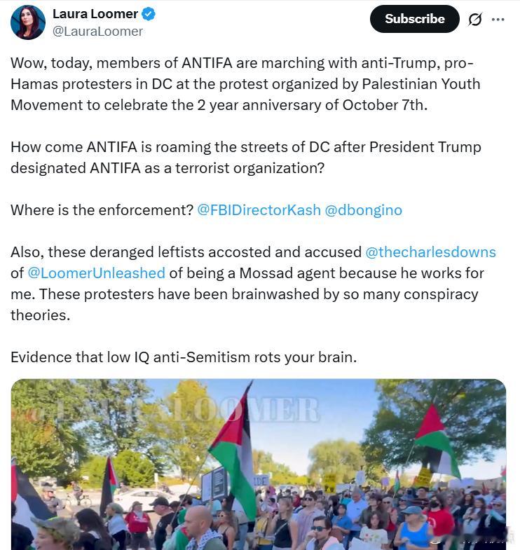 今天在华盛顿特区,安提法的成员与反特朗普、支持哈马斯的抗议者一起游行,这场抗议是由“巴勒斯坦青年运动”组织的,用来庆祝10月7日事件两周年。