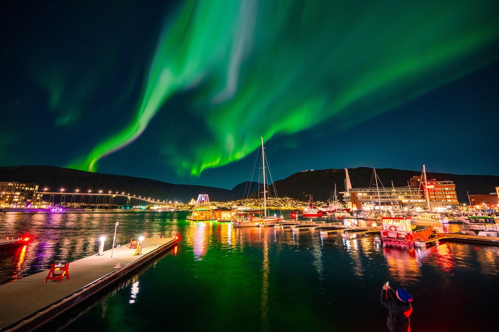 “极光之都”特罗姆瑟从不让人失望!团队正午抵达,夜幕便邂逅一场震撼极光秀——时而如丝带漫舞,时而似火焰腾跃。同学们追光拍摄,每帧画面都定格下北极夜的浪漫馈赠。