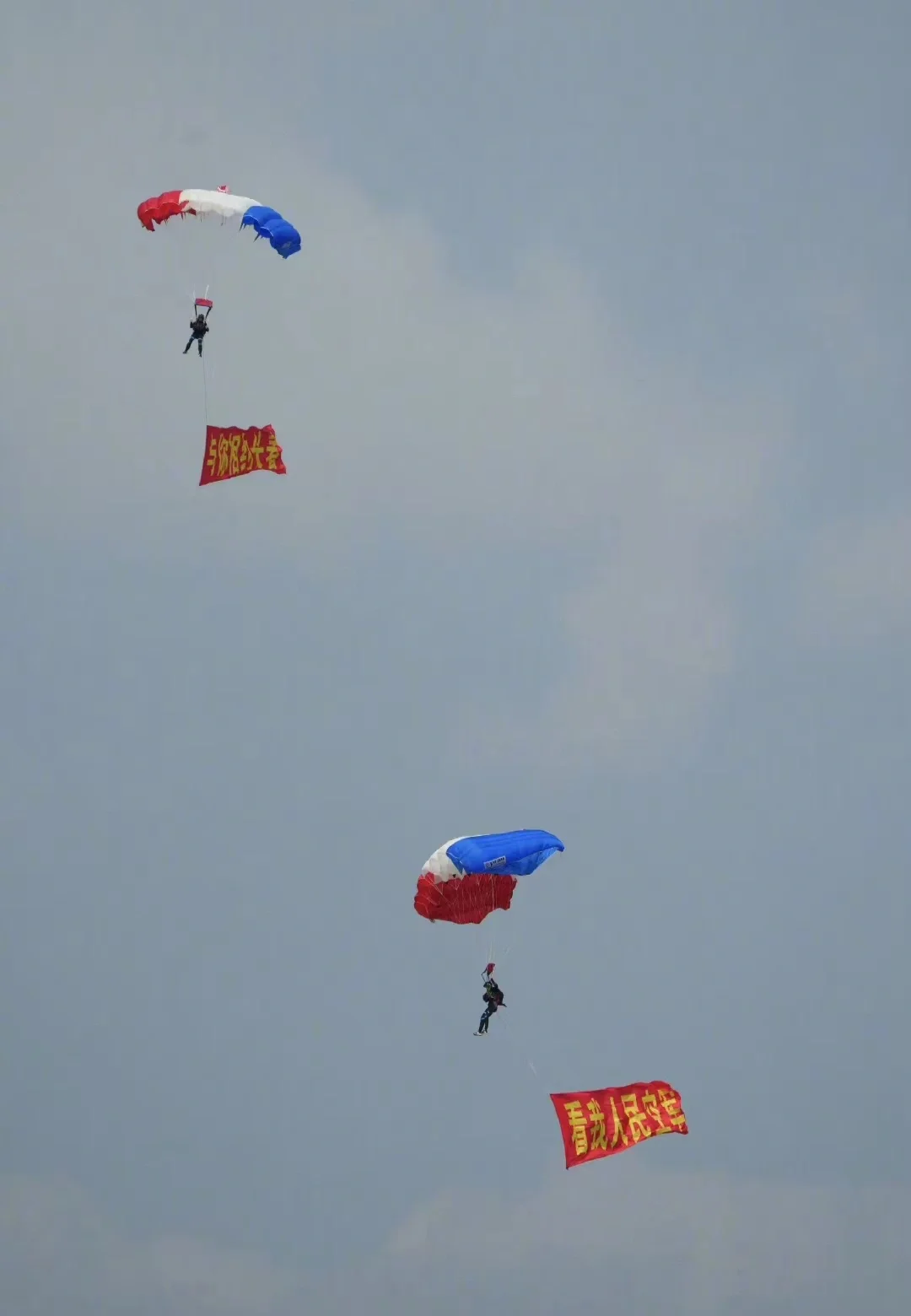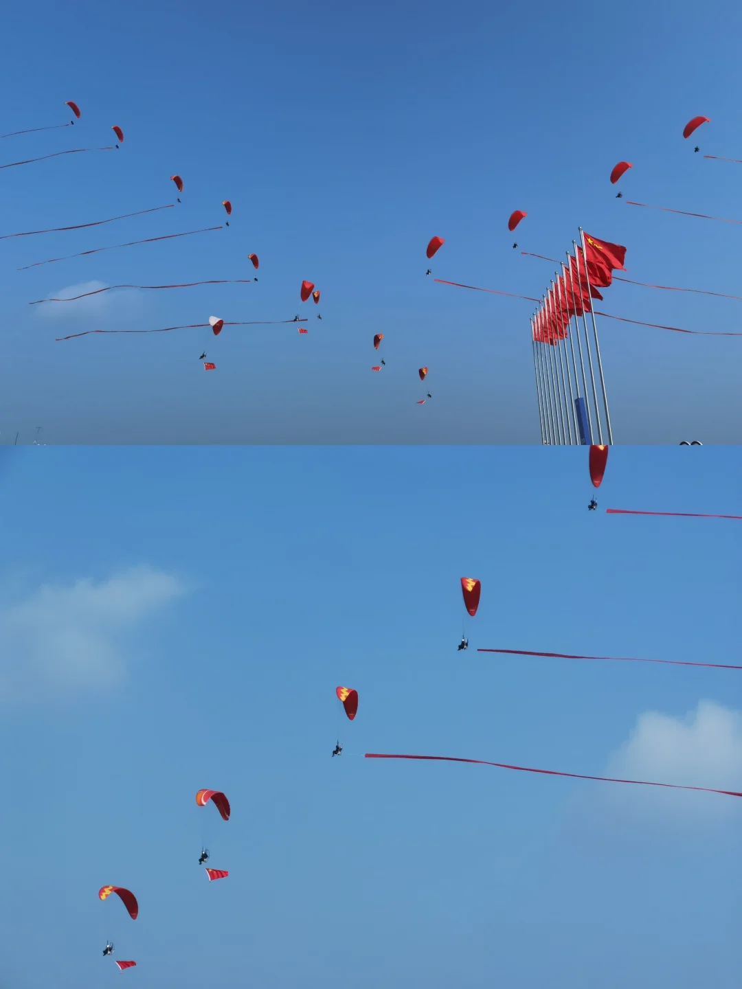 1⃣八一、蓝鹰跳伞队跳伞表演:在空中依次展开了中国共产党党旗、中国国旗、八一军旗和空军军旗~
