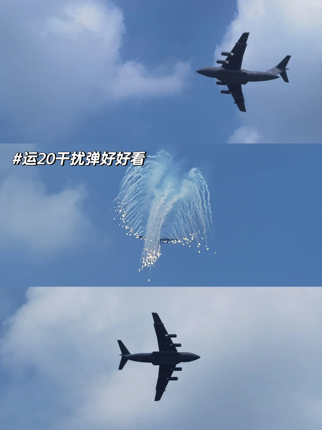 8⃣运油-20A单机展示:公开展示释放干扰弹~蔚蓝天空中干扰弹喷射而出,如同巨大的烟花绽放,震撼无比~