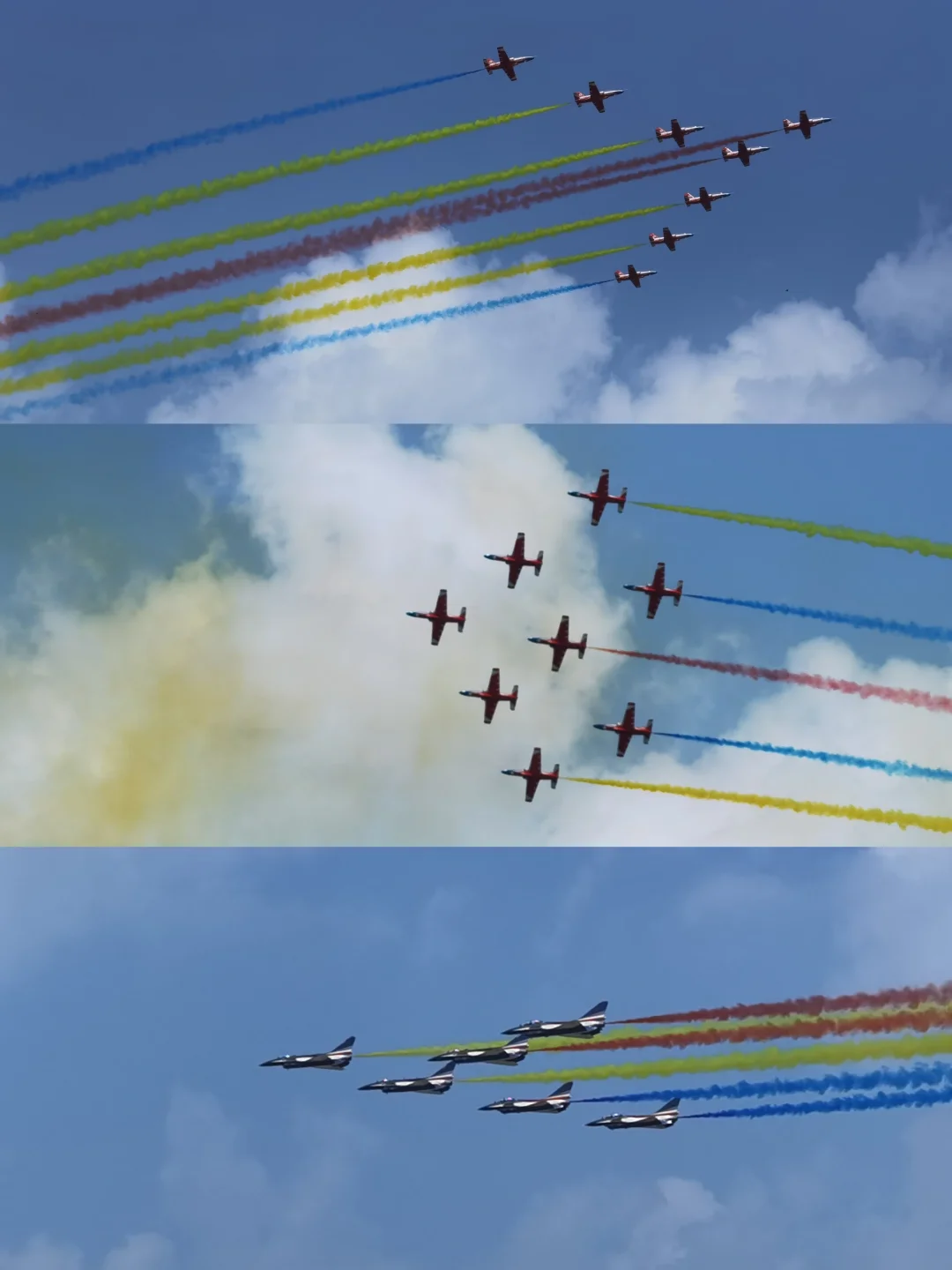 2⃣空军“红鹰”飞行表演队飞行员驾驶8架教-8飞机冲上云霄,率先亮相~拖着彩色的烟带,宛如一只雄鹰在蓝天起舞,用独特的空中礼节向各位致敬❗️