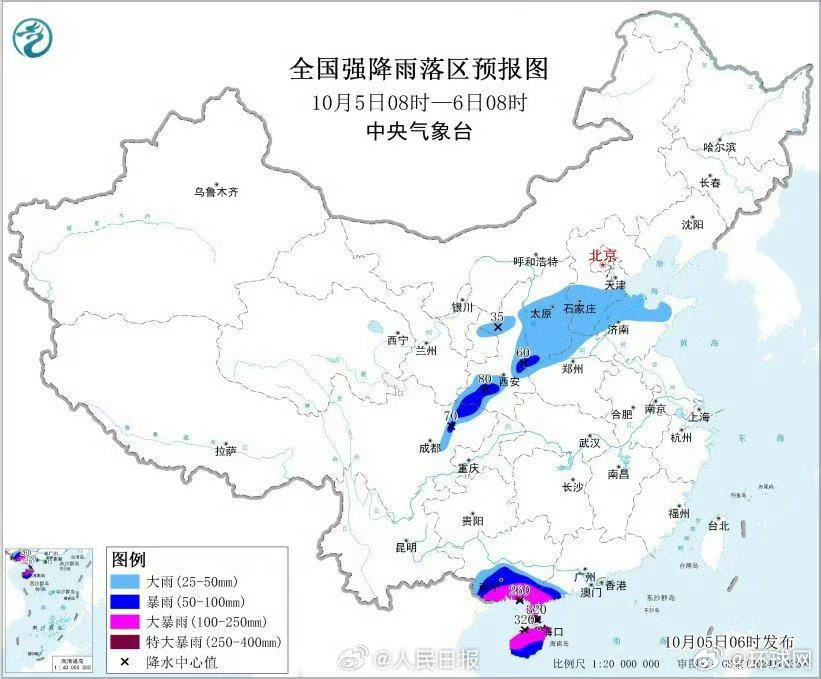 [话筒]10月5日8时至6日8时,海南岛大部、广东西南部、广西南部等地部分地区有暴雨到大暴雨,局地特大暴雨(250~320毫米)。