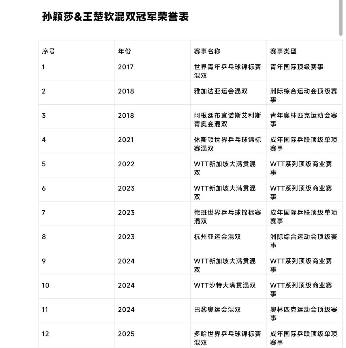 孙颖莎、王楚钦斩获中国大满贯混双冠军!这是莎头第13个世界冠军 莎头组合冠军数刷