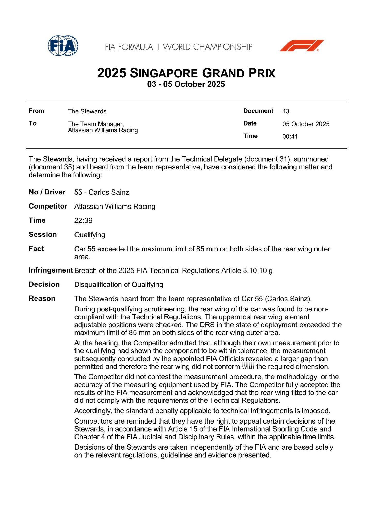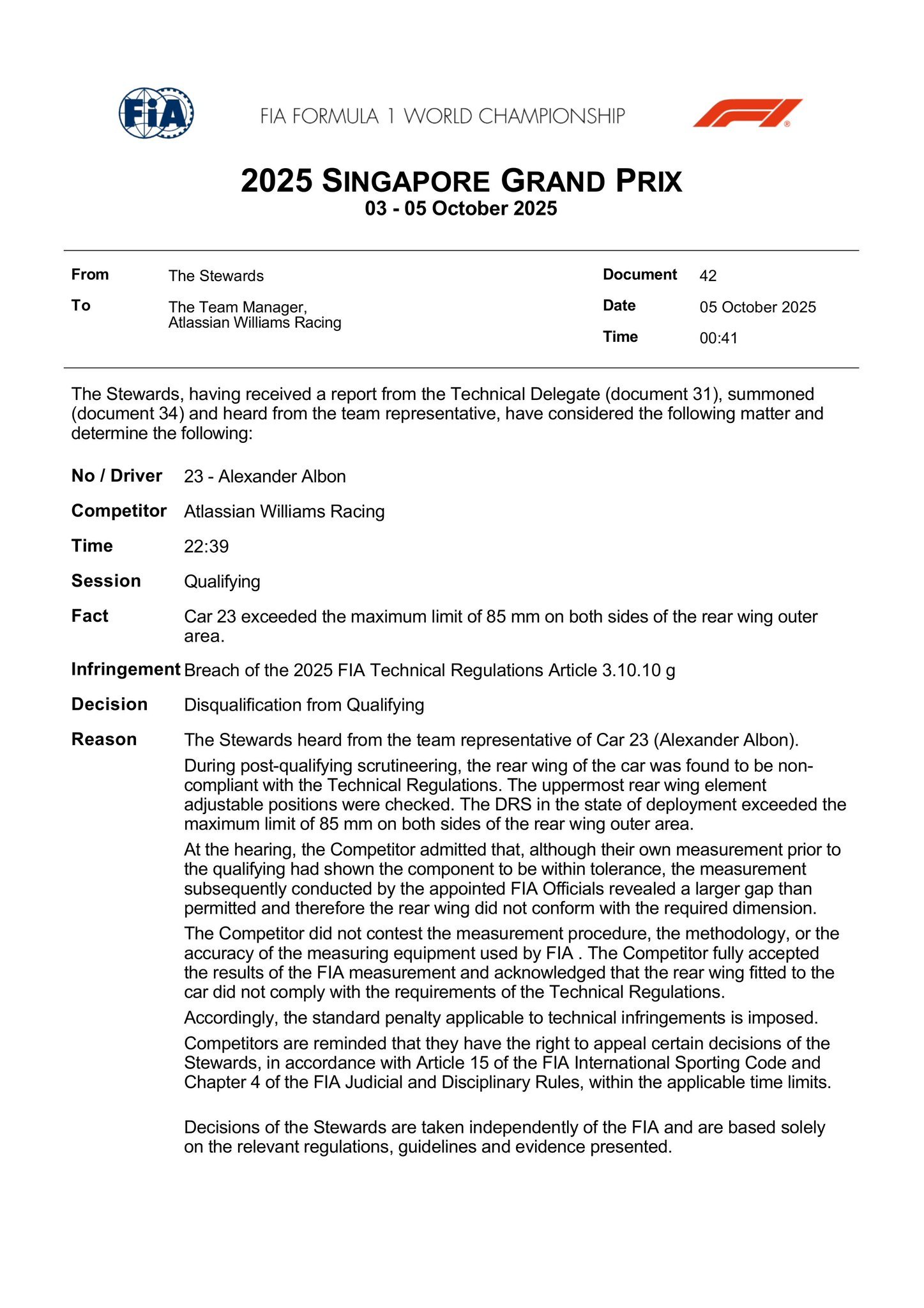 两位威廉姆斯车手由于尾翼违规被取消了排位赛成绩2025f1新加坡大奖赛