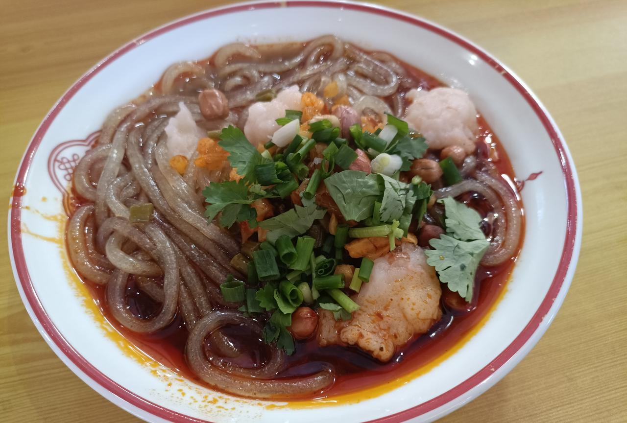 #带定位聊本地新鲜事# 这顿早餐花了我22块钱,你信不? 一碗酸辣粉,搭配5个虾滑,共计22块钱,味道不错,就是贵了点!