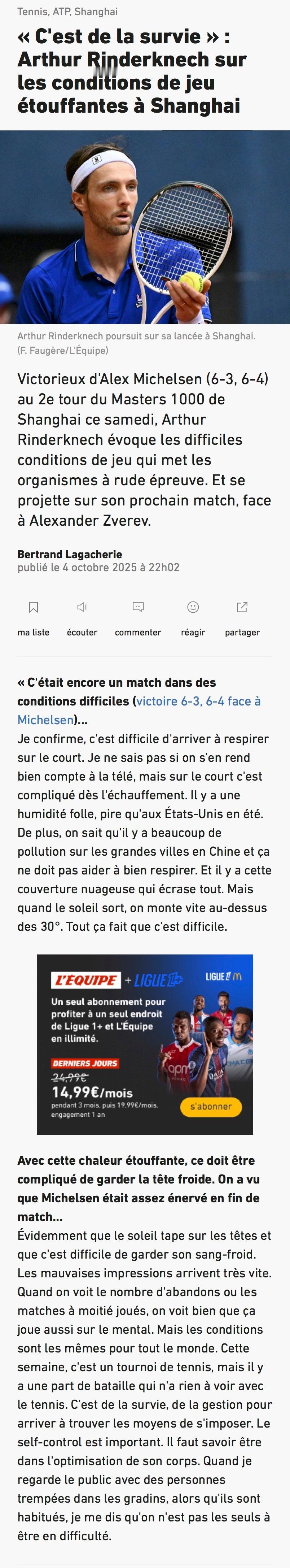 昨天在上海大师赛第二轮6-3/6-4击败米克尔森后,法国选手林德克内希在接受《队报》采访时评价上海的湿热天气,并吐槽中国大城市污染严重[无聊]