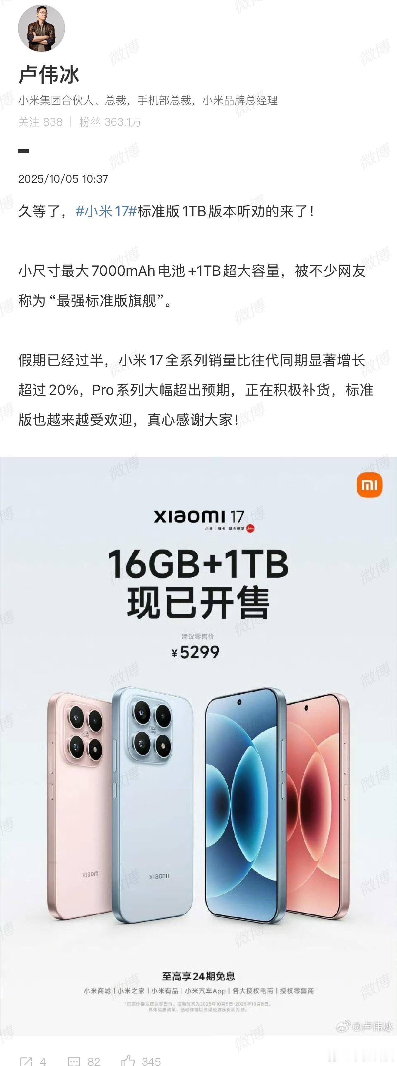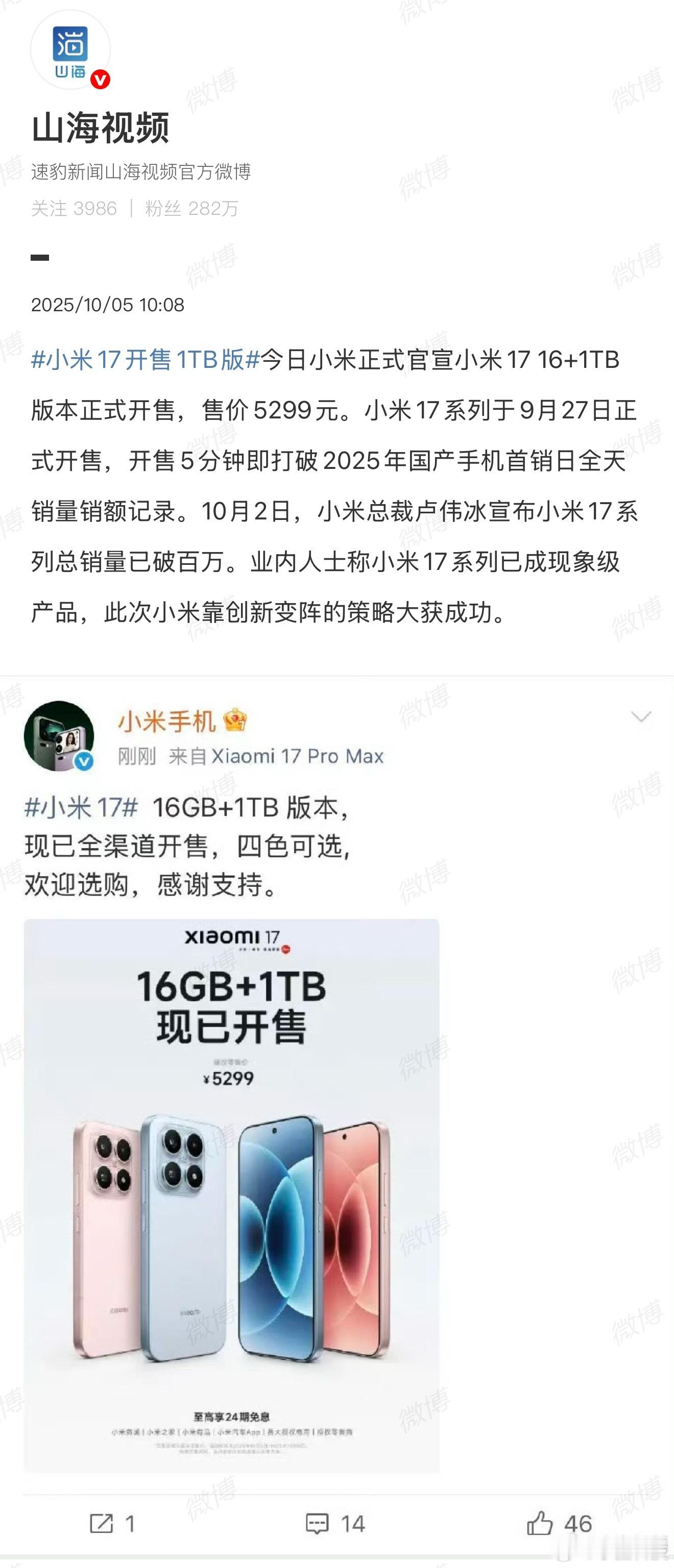 小米17开售1TB版永远不要质疑小米的宠粉程度!之前好多人说小米17系列没有1TB版本,希望能出1TB的!这不,它真的来了!先不说小米卖的有多火,就这种用户要什么就给什么的态度,就足够让人感动了。