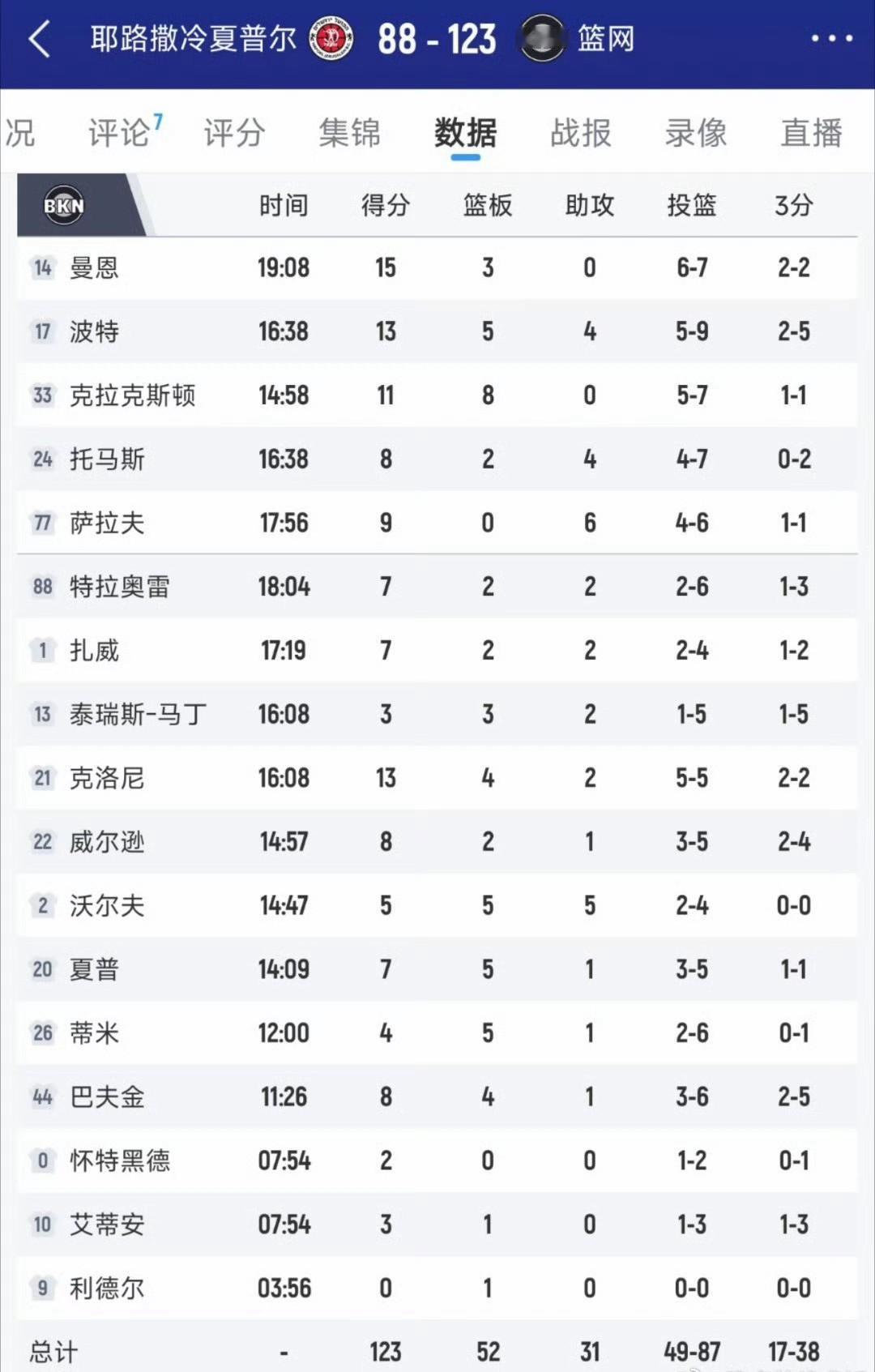 篮网这个队太奇葩了,全联盟最菜的阵容打个季前赛还整的极其认真。 季前赛首战,篮网主场123-88大胜以色列球队耶路撒冷夏普尔。篮网共17人登场,曾凡博并未获得出场时间。
