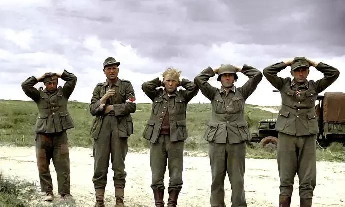 二战时期,被盟军俘虏的纳粹德军士兵。日耳曼人身高也不过如此,这五个战俘除了左起第