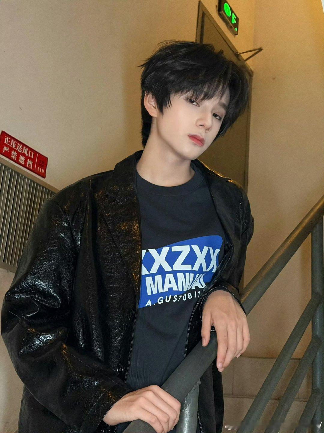 王橹杰黑皮衣随拍王橹杰黑皮衣look王橹杰楼梯间黑皮衣随拍立体五官深邃眼神又帅又