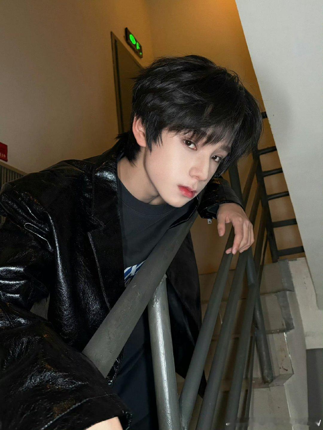王橹杰黑皮衣随拍王橹杰黑皮衣look王橹杰楼梯间黑皮衣随拍立体五官深邃眼神又帅又迷人氛围感拉满