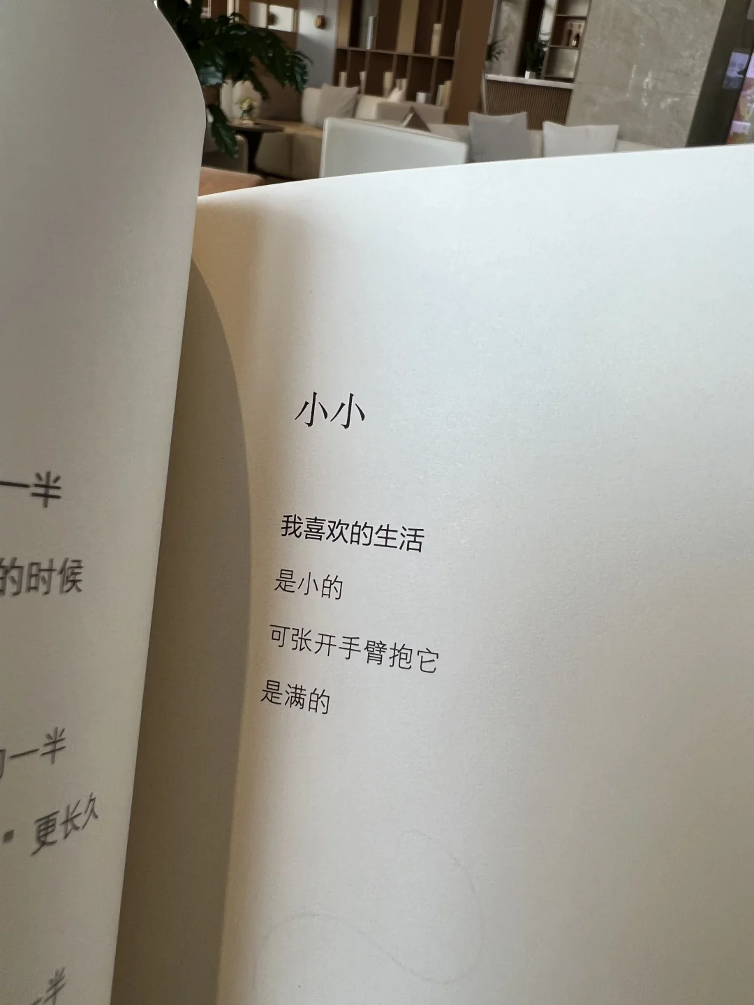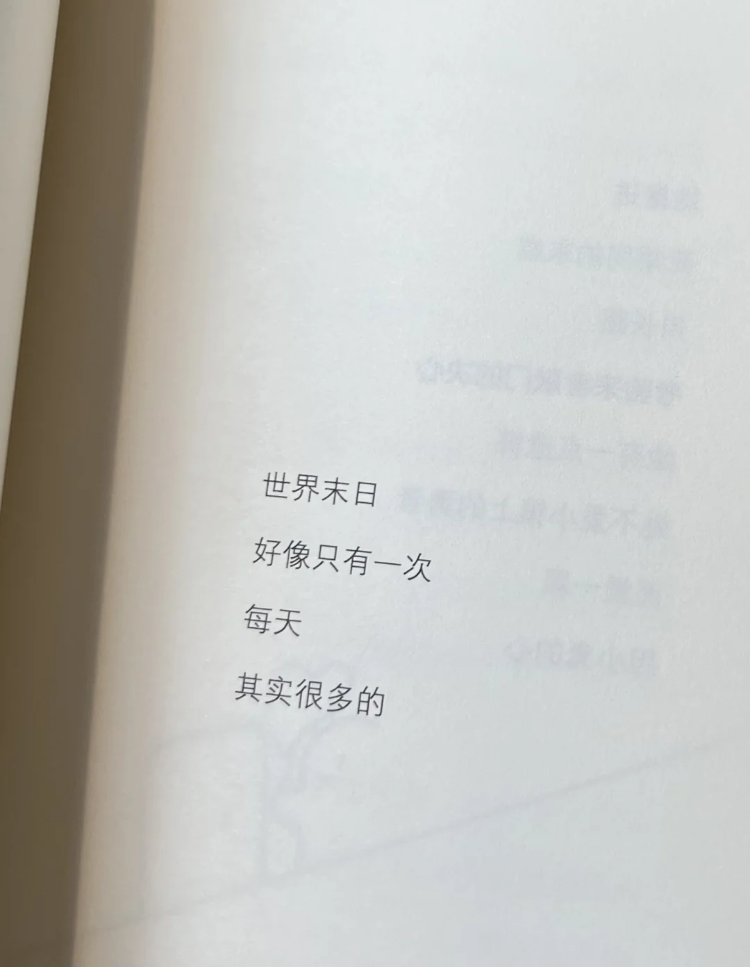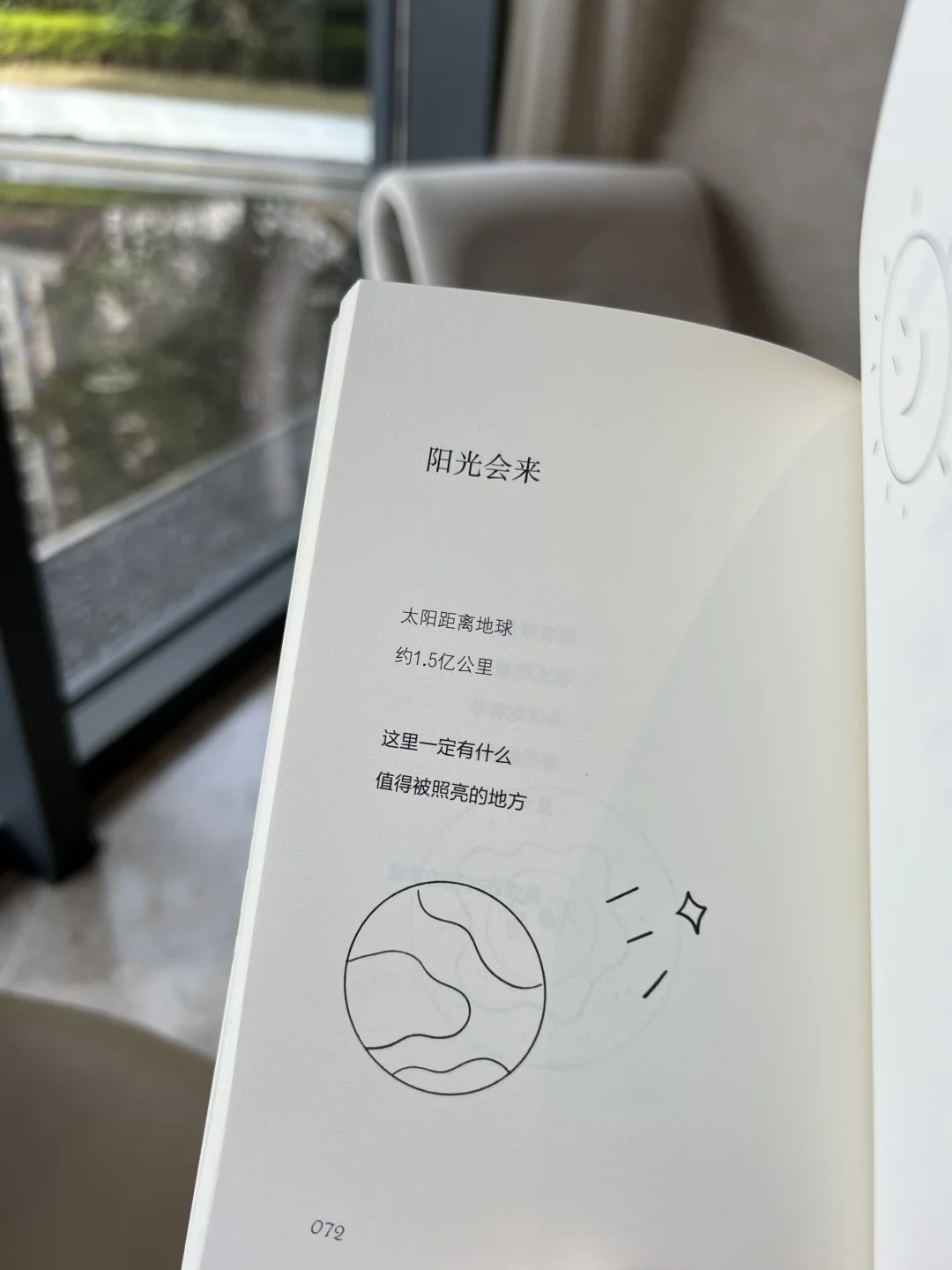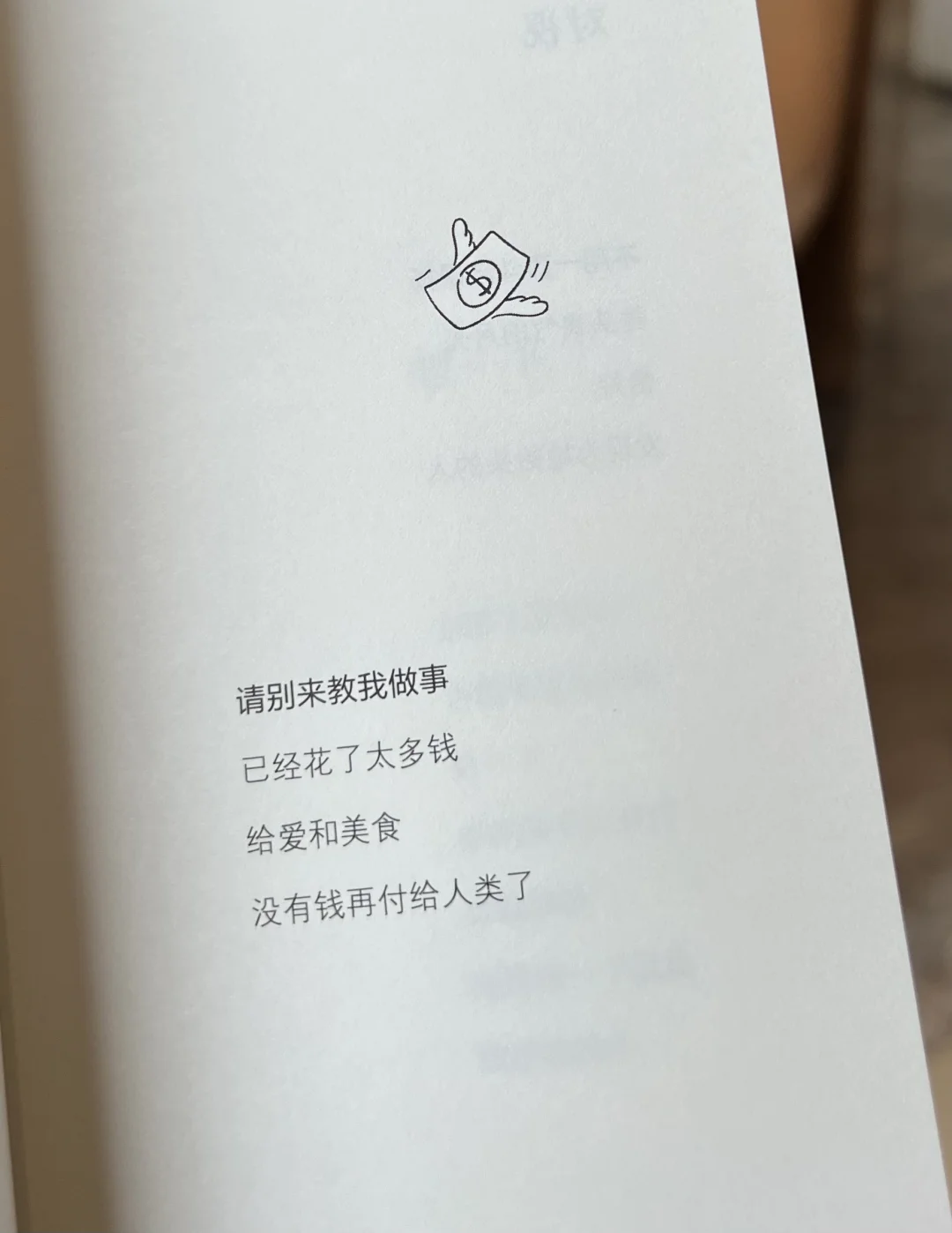 📗书名:《不写给世界,只写给你》 ✏️作者:礼貌诗人 · ❤️一个字是一片波浪 希望它们辽阔、阳光 爱你,陪着你 · 🟣 【人生规划 】 我就打算这样去生活 做一朵花 但不以引诱为理想 做一朵上午的花 无比需要阳光、水、氧气 望向世界 而不需要世界太多的声音 🟣 【伟大的生活】 我喜欢过伟大的生活 大大的沙发 大口吃饭 大太阳 大约9点钟起 🟣 【泡泡】 今天什么事都不想做 连泡泡都是风帮我吹的 🟣 【太阳的理想】 问太阳 今天的理想是什么 “按时下班” “人类比我更需要夜晚” 🟣 【打盹的春】 这春天睡大觉等同于浪费时间 不在春天睡大觉等同于浪费春天 🟣 【对视】 不用一直斗志昂扬 垂头丧气的月亮 恰好发现为它抬头的人 🟣 【好的OK】 卡拉OK 散步也OK 听劝OK 不听劝也OK 矿也OK 精神退休也OK 是我自己就OK 🟣 生活中的乐趣大概像这样,边走边看,轻轻的喜欢,读一读小诗,希望你暖洋洋
