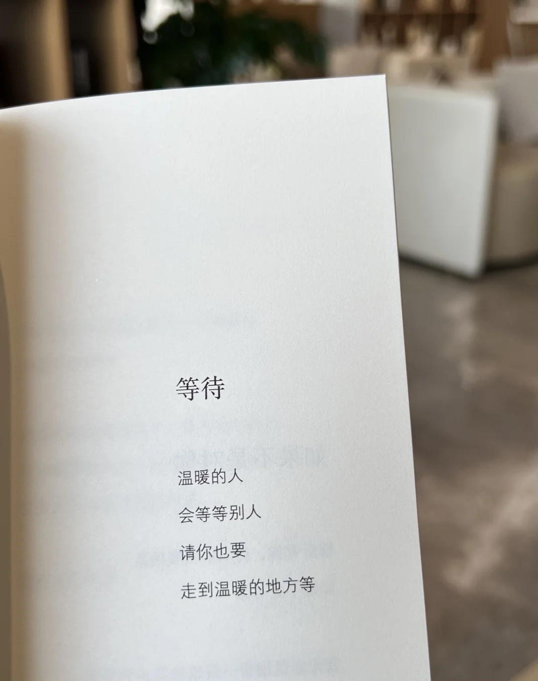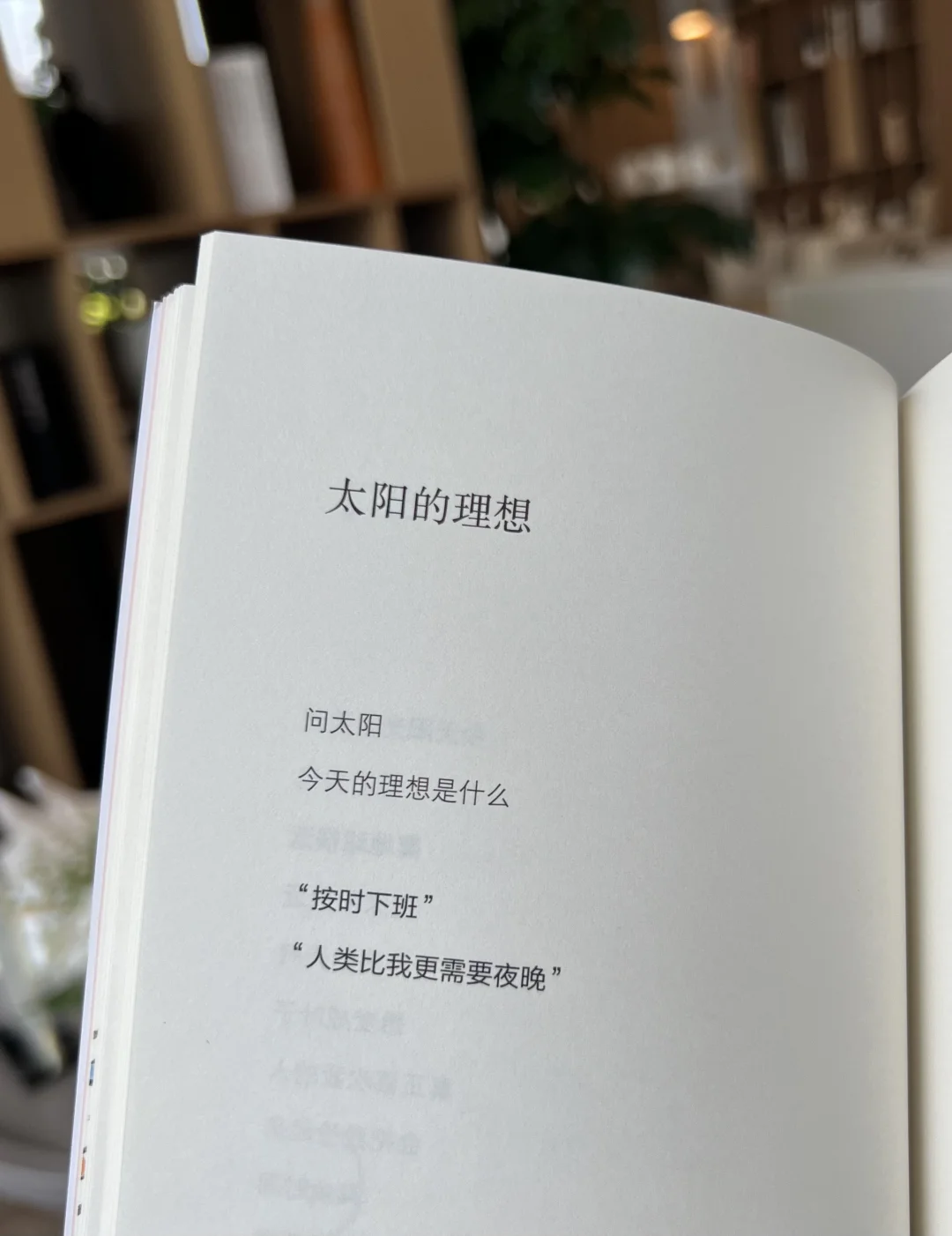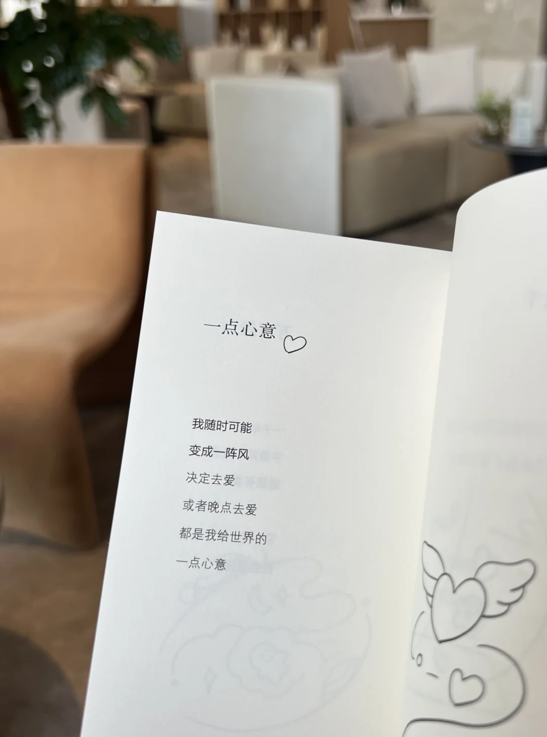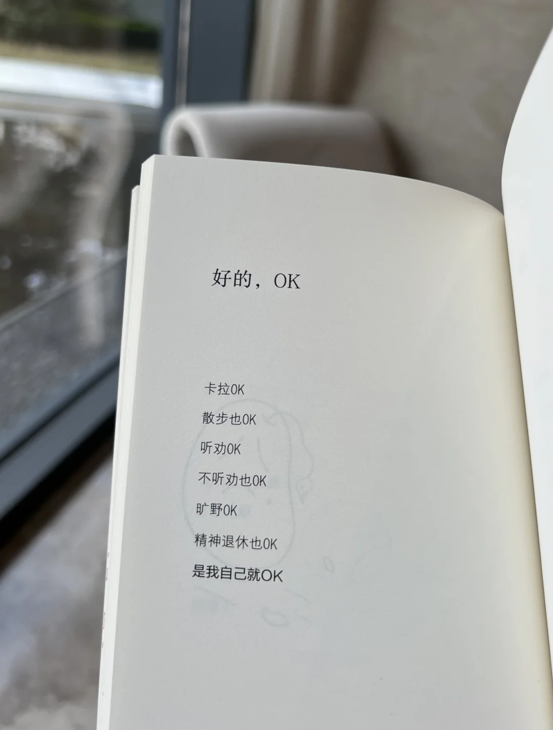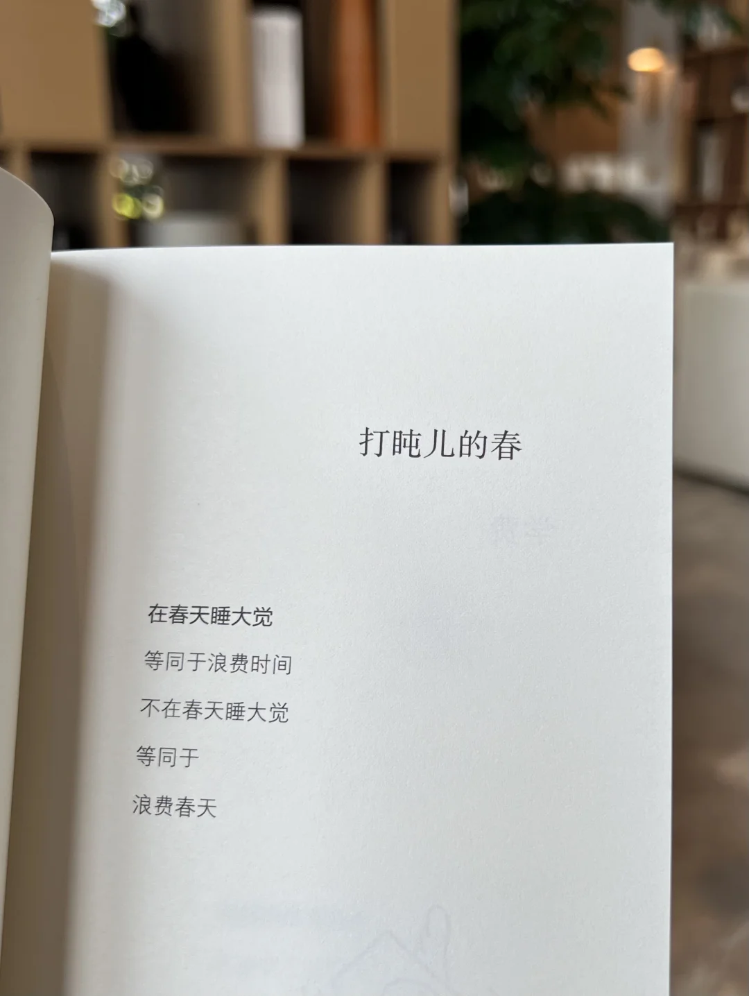 📗书名:《不写给世界,只写给你》 ✏️作者:礼貌诗人 · ❤️一个字是一片波浪 希望它们辽阔、阳光 爱你,陪着你 · 🟣 【人生规划 】 我就打算这样去生活 做一朵花 但不以引诱为理想 做一朵上午的花 无比需要阳光、水、氧气 望向世界 而不需要世界太多的声音 🟣 【伟大的生活】 我喜欢过伟大的生活 大大的沙发 大口吃饭 大太阳 大约9点钟起 🟣 【泡泡】 今天什么事都不想做 连泡泡都是风帮我吹的 🟣 【太阳的理想】 问太阳 今天的理想是什么 “按时下班” “人类比我更需要夜晚” 🟣 【打盹的春】 这春天睡大觉等同于浪费时间 不在春天睡大觉等同于浪费春天 🟣 【对视】 不用一直斗志昂扬 垂头丧气的月亮 恰好发现为它抬头的人 🟣 【好的OK】 卡拉OK 散步也OK 听劝OK 不听劝也OK 矿也OK 精神退休也OK 是我自己就OK 🟣 生活中的乐趣大概像这样,边走边看,轻轻的喜欢,读一读小诗,希望你暖洋洋