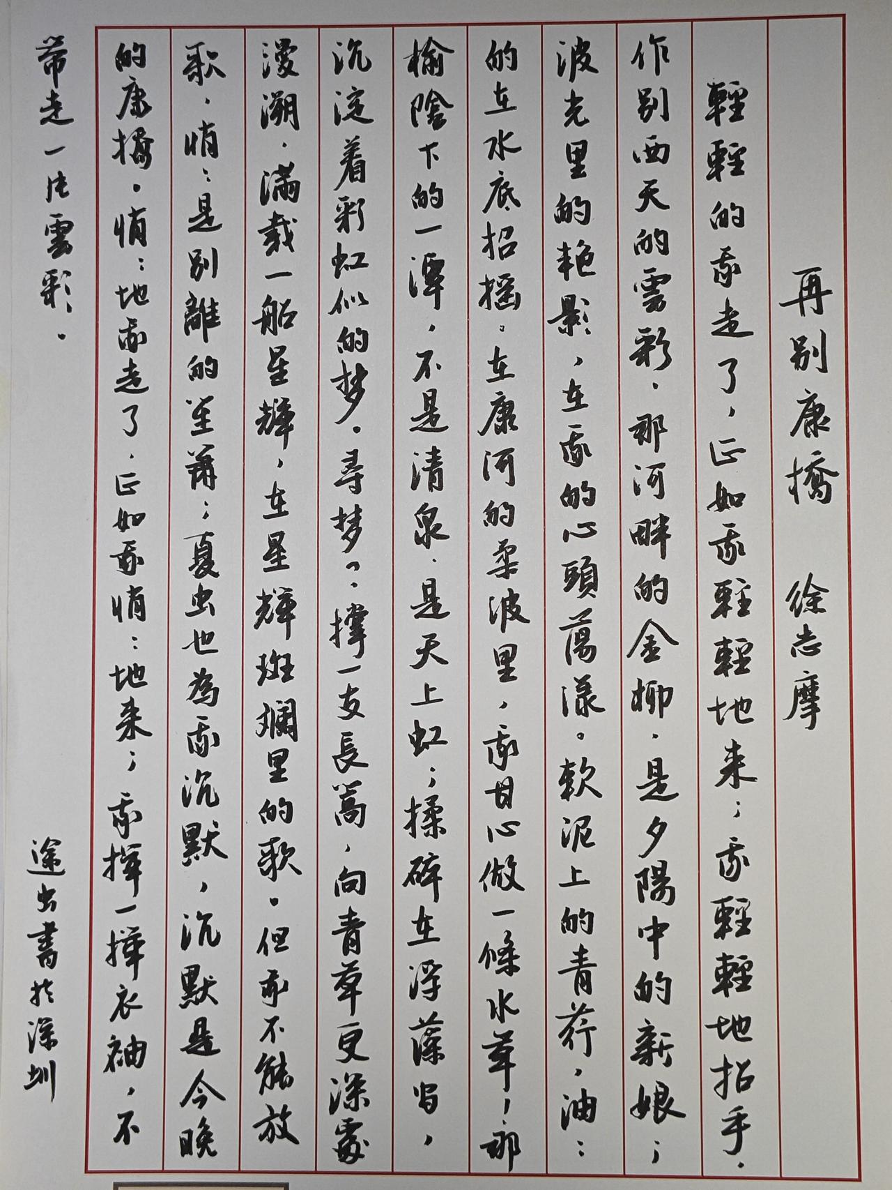 这一首诗,相信70后的很多人都会背诵,70后的很多人都用他的练字。《再别康桥》,我们那个年代最熟悉的爱情诗了。我读高中的时候,几乎每一个同学都曾经用这首诗来练字。今天偶然又发现这首诗,忍不住又把它写了一遍。其实要说写字,真的还是觉得高中的时候字写得最好,那个时候我的班上有几个书法高手,我的字是跟他们学的,骄傲一点说,我当时只能排进班上前五就不了。书法爱好者 书法 成人【行书速成字帖】行书入门笔画偏旁控笔常用3000字硬笔练习纸