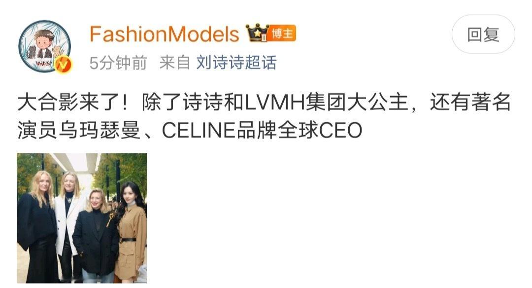 大合影来了!刘诗诗,CELINE品牌全球CEO,LVMH集团大公主,著名演员乌玛瑟曼合影,