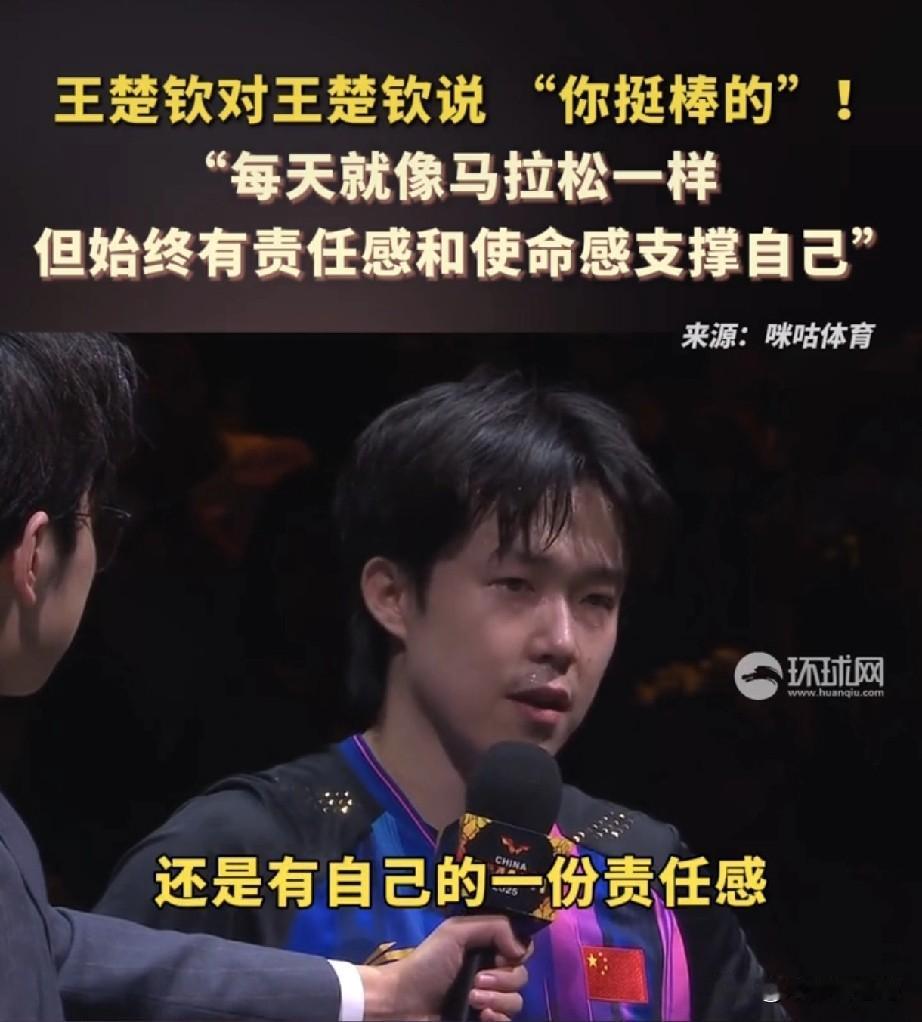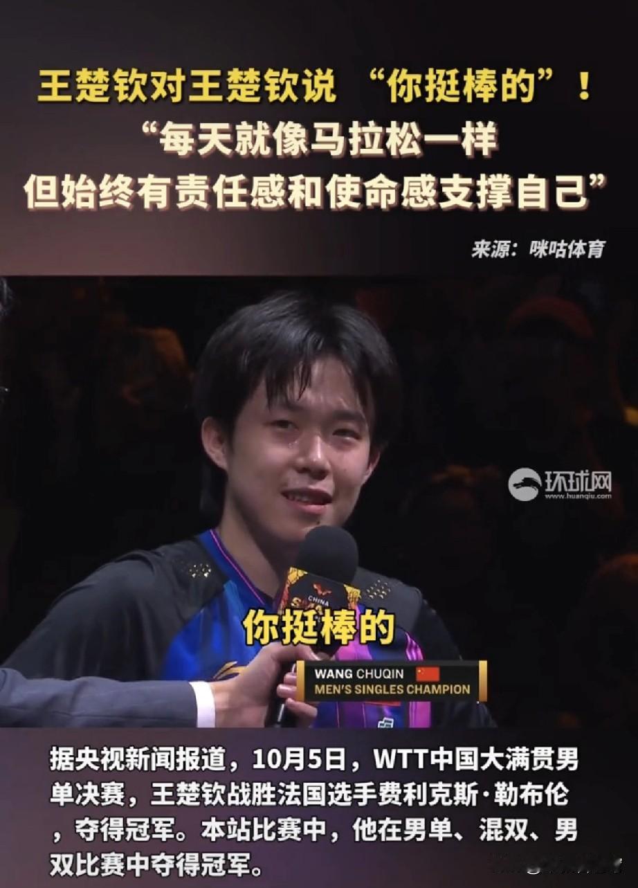 王楚钦对王楚钦说:你挺棒的!没错,就是王楚钦对王楚钦说的,说这句话时,王楚钦脸上露出略带羞涩的微笑,但是看得我眼泪一下子就流了出来,我们的“三冠王”此时肯定是感慨万千! 对手比赛前信誓旦旦,说什么自己想完成对阵国乒“一串四”的壮举,比赛中,王楚钦给他剃了个漂亮光头,4比0,勒布伦输得心服口服。 要知道,这还是身体上非常疲惫的王楚钦,如果给他足够的休息时间,勒布伦的光头只会更亮。 很累,不只是我们感觉到的累,即使王楚钦也明显感到了,“每天都像马拉松一样,但始终有责任感和使命感支撑自己”! “也想对王楚钦说声,你挺棒的!” 王楚钦很少说这样的话,毕竟,一个人佩服别人很容易,一个人佩服自己就会很难。 男单,混双,男双,三项冠军都在证明,王楚钦是现在毫无争议的世界第一。 希望王楚钦继续加油为国争光,但是真的不愿意看到他这么累。