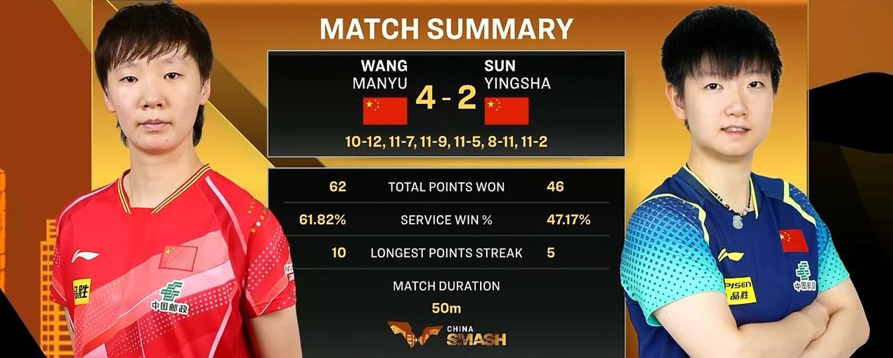 王曼昱力克孙颖莎夺得WTT中国大满贯丨女单冠军,成为本站比赛双冠王! 本场比赛首局打的很胶着,孙颖莎以12-10险胜,展现正手强攻优势。 随后王曼昱通过反手拧拉和相持稳定性连扳三局(11-7、11-9、11-5),尤其在第三局9-9后连得2分奠定优势。 第六局王曼昱以11-2速胜,凭借发球抢攻和落点控制锁定胜局夺冠。 此前王曼昱/蒯曼已获得女双冠军,因此她成为本站比赛女单、女双双冠王!