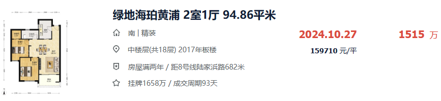 贝壳找房网数据显示,去年10月,小区成交一套建面约94.86㎡房源,成交总价约1515万,折合单价约15.97万/㎡。