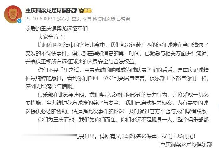 直播吧10月6日讯中甲第25轮,事关冲超和保级的焦点战中,重庆铜梁龙客场2-1击败广西平果。赛后双方球迷爆发冲突,随后重庆铜梁龙官方发布声明,坚决反对任何形式的暴力行为,并将采取一切必要措施,全力维护我方球迷的尊严与安全。