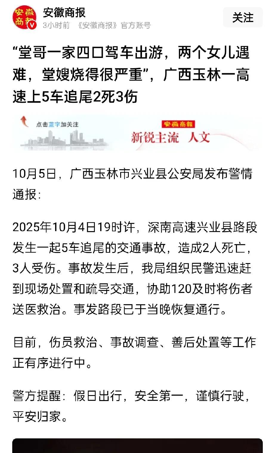 2女孩身亡,车辆都烧成空壳了!广西玉林一高速多车发生车祸,一共5辆车,发生连环碰撞追尾,导致2死3伤。 这起事故发生在节日期间,很让人感到惋惜和遗憾,据2名死者的亲属称,遇难者是他堂哥的2个女儿,一个刚刚上小学6年级,另一个女儿才4、5岁。 并且说他堂哥堂嫂一家4口是开车出去旅游的,在旅游途中发生了这种不幸。 看车祸现场图片,发生碰撞以后,车辆出现了猛烈的燃烧,不知道里面是不是有新能源车,因为锂电池一旦燃烧的话,是很难扑救的,而且爆燃很剧烈,快速。 现在新能源电动汽车已经占了相当大的比,这种车在使用过程中经济,环保,安全,快速。 但是如果发生碰撞的话,就会有不可预料的情况发生,特别是电池包受到挤压以后,有短路起火爆燃的可能。 所以正是因为现在高速公路上运行的有很多新能源电动车,开车的人们才更应该注意前后车之间的车距。 一定要保持在安全车距之内,避免发生刚性碰撞。 各位网友,怎么看呢?欢迎评论区留言讨论