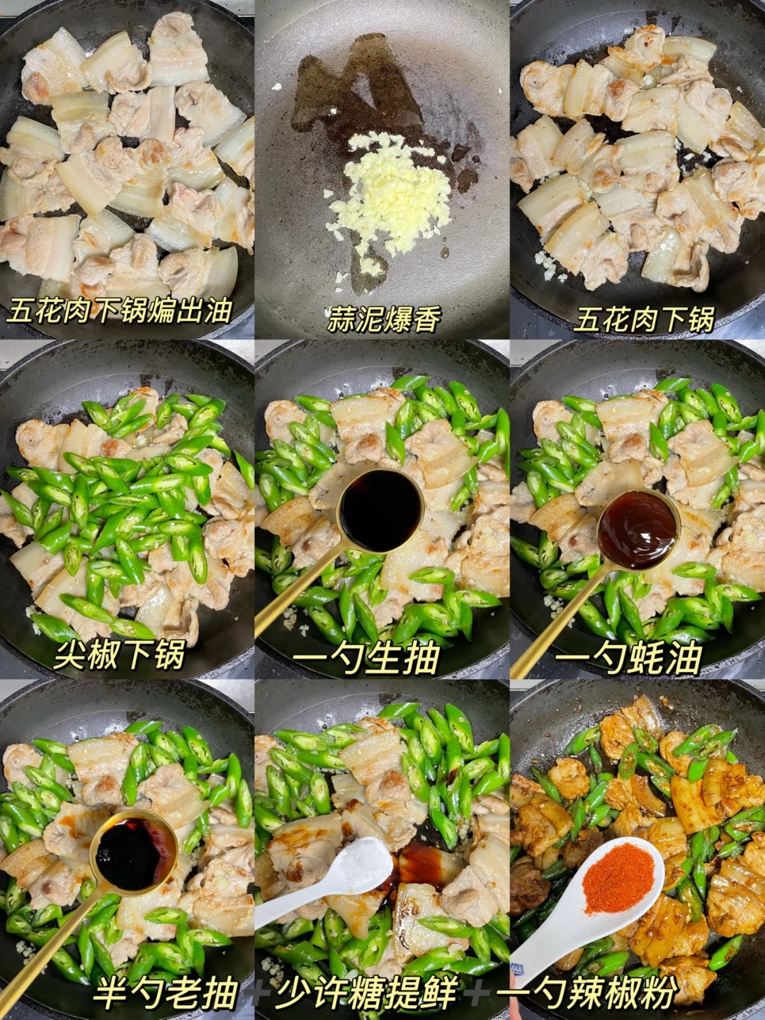 2⃣️蒜泥爆香,倒入五花肉片和线椒翻炒,放入一勺生抽➕一勺蚝油➕半勺老抽➕少许糖调味➕一勺辣椒粉,爆炒2分钟就可以出锅啦!