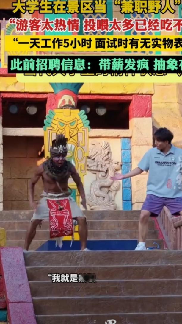 现在的大学生兼职花样真不少,有人跑去景区当“野人”。高校学生小林就干了这活儿,景区为打造原始部落体验项目,让他们扮“野人”互动合影。 本以为是美差,结果被游客投喂整懵。一开始是水果饼干,后来规格越来越高,鸡蛋、辣条、酸奶、烤肠都来了,还有人塞坚果让“野人”补充营养。 小林从配合投喂到婉拒,每天嘴巴不停,下班回家饭都吃不下。不过这也算是别样体验,这届大学生打工,真是玩出了新花样,在烟火气里收获了特别的快乐。