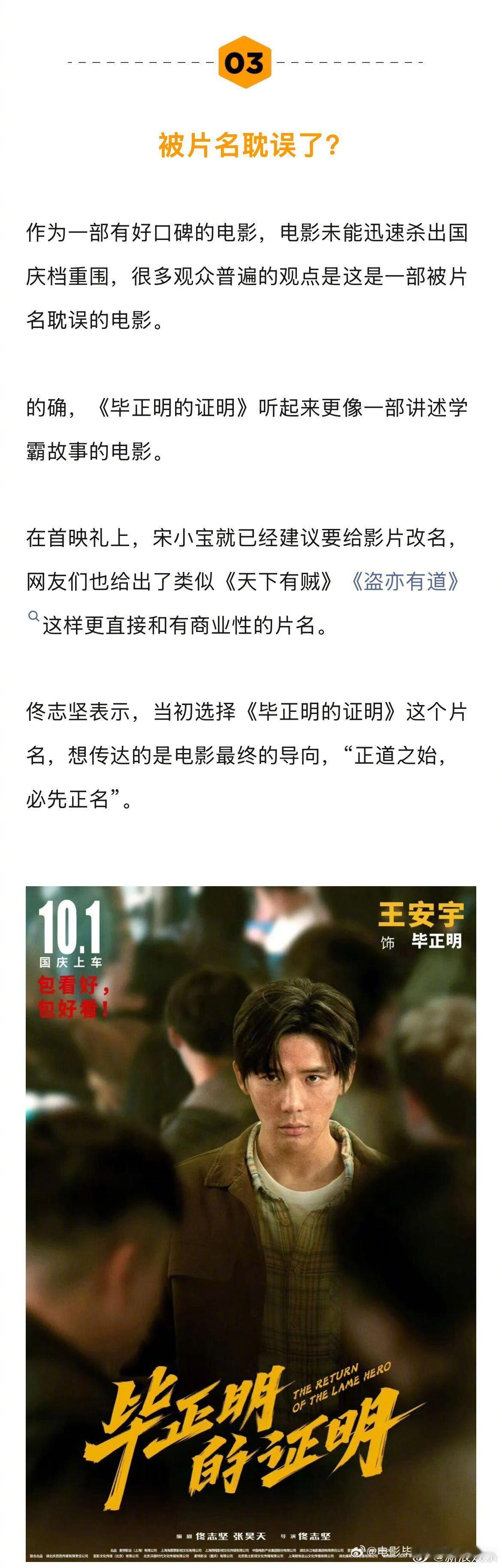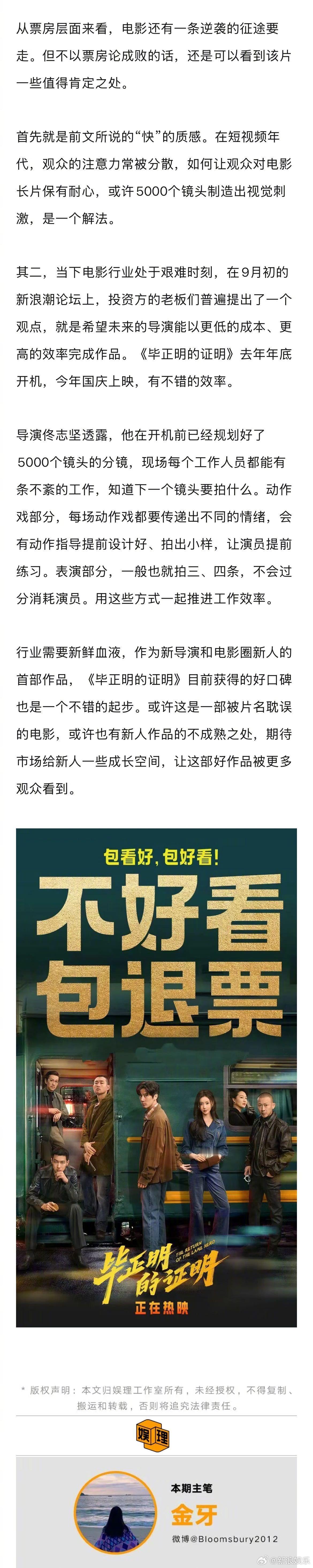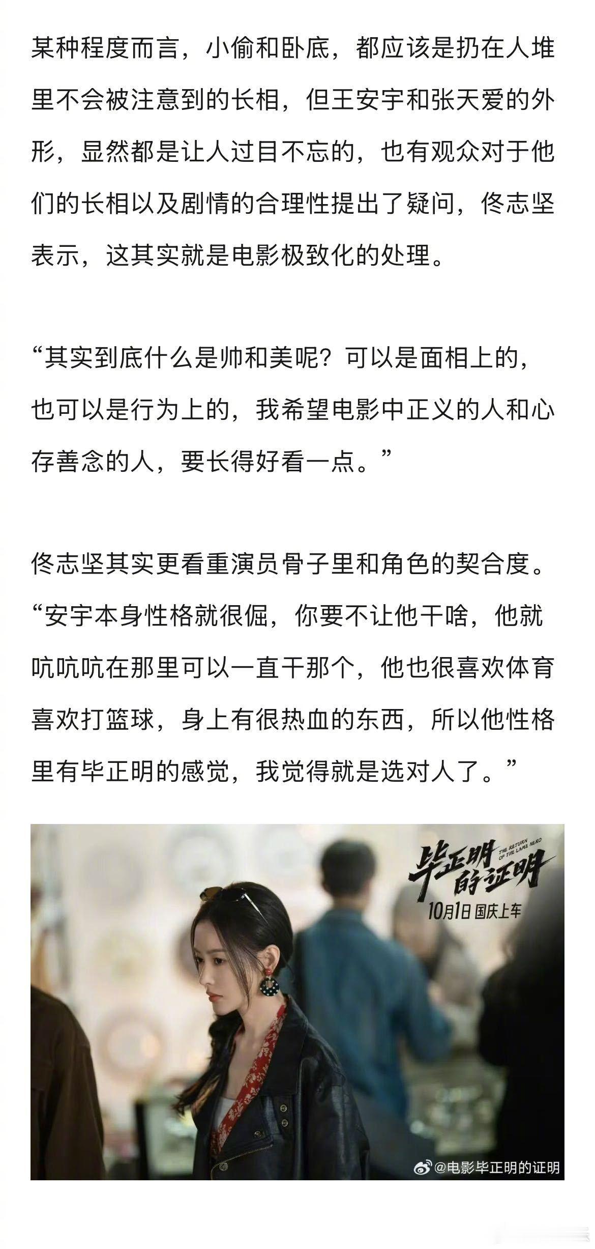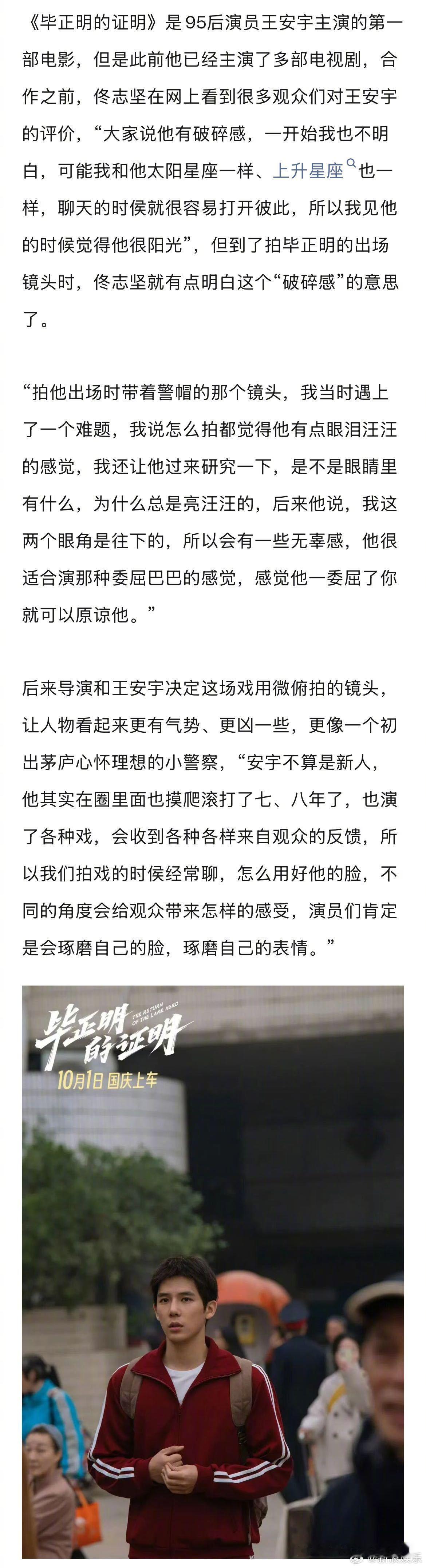 【导演说王安宇适合演委屈巴巴】毕正明的证明导演说王安宇眼泪汪汪《毕正明的证明》目前评分处于国庆档电影的第一梯队,从10月3日开始已经实现了票房逆跌。这是一部很“新”的电影,观感上的“新”最直接的原因是导演在“快意恩仇”的“快”上下了功夫,同时也表现在剪辑上的节奏快与眼花缭乱。导演谈及主演,直言选对人了,还称赞说:“他很适合演那种委屈巴巴的感觉,感觉他一委屈了你就可以原谅他”。(新浪娱乐、娱理)