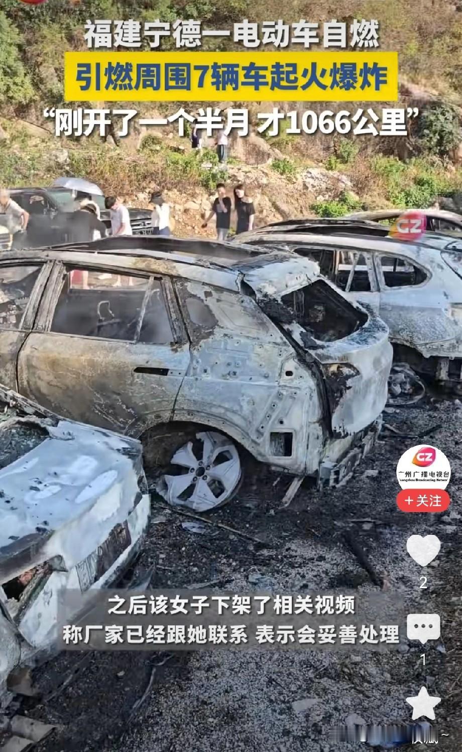 刚刚看到广州广播电视台报道! 福建宁德1辆电动车自燃,导致周围7辆车全部被烧。这应该是一个个例,但是,可以看出锂电池的安全问题,还有很大的空间去克服。也幸亏当时车上没有人,如果当时车上有人,火势迅速蔓延,门锁打不开了怎么办? 当然了,现在固态电池正在以研发之中。一旦固态电池研发出来,这些问题可能都解决了。再给企业技术人员一点时间吧。