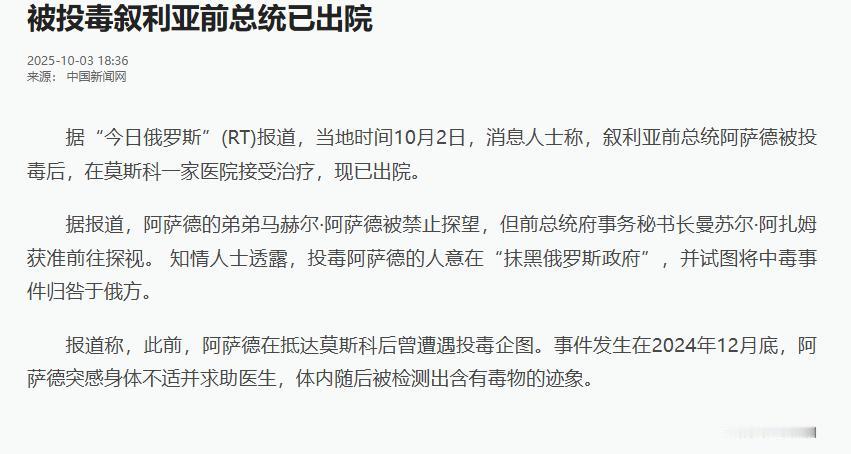 重磅消息!俄罗斯承认阿萨德被投毒!多家俄罗斯媒体在报道中承认,叙利亚前总统阿萨德此前确实被投毒,但在报道中强调,阿萨德已经安全出院。此外,相关报道中称,投毒者的目的非常明确,就是为了在阿萨德抵达莫斯科避难之后,故意用类似的手段栽赃俄罗斯政府、将阿萨德中毒的事件归咎于俄罗斯。 这些人显然早有预谋,专门选在阿萨德抵达莫斯科寻求庇护之后动手。 他们想用这种阴狠手段,把中毒事件的黑锅直接扣在俄罗斯政府头上,达成栽赃陷害的目的。 这一下,所有人都懂了之前俄方沉默的原因。 时间倒回2024年12月底,刚流亡到俄罗斯的阿萨德突然感到身体不适。 他立刻求助医护人员,随后的检测直接揪出了问题——体内存在明确的毒物迹象。 消息当时通过叙利亚人权观察组织悄悄流出,瞬间引发轩然大波。 约旦日报、英国太阳报等多家媒体纷纷跟进,报道都指向同一个结论:阿萨德遭人投毒了。 更揪心的消息在9月下旬传来。中东媒体披露,阿萨德病情突然恶化。 他出现了剧烈咳嗽、胸闷和神经系统紊乱等症状,呼吸都变得急促。 俄方紧急将他送往莫斯科郊区一家高度保密的医院,直接推进了ICU抢救。 叙利亚人权观察组织当时还通过社交媒体喊话,声称阿萨德已生命垂危,要求俄罗斯官方给出解释。 可面对各方追问,克里姆林宫始终闭口不谈,拒绝发表任何评论。 这种沉默在当时引发了各种猜测。有人说阿萨德其实是被俄方软禁,中毒只是权力博弈的幌子。 也有人分析,俄方可能在暗中调查,不想打草惊蛇。 现在谜底彻底揭开,那份沉默根本不是心虚,而是对阿萨德最稳妥的保护。 下毒者的算盘打得噼啪响。他们精准拿捏了舆论心理。 阿萨德身在俄罗斯境内,受俄方严密保护,一旦出事,外界第一反应必然是怀疑东道主。 只要阿萨德中毒的消息传开,不用投毒者多费口舌,各种指向俄罗斯的猜测就会自动发酵。 这种“此地无银三百两”的栽赃套路,确实够阴险。 好在俄罗斯的医疗团队够给力。阿萨德在ICU抢救11天后,总算从鬼门关捡回一条命。 当地时间10月2日,消息人士确认了他出院的消息,这场牵动中东局势的健康危机才算暂告段落。 紧接着,另一条消息佐证了阿萨德的安全状况。 叙利亚前总统府事务秘书长曼苏尔·阿扎姆已经获得俄方批准,专程前往探视阿萨德。 能允许亲信探视,说明阿萨德的身体已经恢复到可以见人的程度,也侧面击碎了“被软禁”的谣言。 回溯整个事件,时间线其实早有迹可循。 2024年12月,阿萨德政权被“沙姆解放组织”推翻后,他和家人就乘坐军机逃往俄罗斯。 克里姆林宫当时就通过塔斯社证实,俄方为其提供了庇护。 从那以后,阿萨德就处于俄方的严密保护之下,几乎从公众视野中消失。 这种低调本是为了规避风险,却没想到还是被投毒者钻了空子。 投毒事件的发生,其实暴露了中东博弈的残酷本质。阿萨德即便已经流亡,仍是各方势力角逐的焦点。 对某些势力来说,搞掉阿萨德不重要,借阿萨德的事搞臭俄罗斯才是核心目标。 他们想通过这起事件,抹黑俄罗斯的国际形象,破坏俄方在中东的影响力。 毕竟,收留阿萨德本身就让俄罗斯在中东格局中占据了特殊位置,这是不少势力不愿看到的。 俄方的处理方式则展现了十足的谨慎。他们没有在第一时间辟谣,而是先集中力量救人、查案。 这种“先做后说”的策略,既保障了阿萨德的安全,也避免了在调查不清时陷入舆论被动。 等到阿萨德安全出院,局势稳定下来,再抛出“栽赃论”,无疑更有说服力。 现在来看,投毒者的算盘算是落了空。阿萨德活下来了,俄方也借媒体发声澄清了嫌疑。 这起事件反而成了一面镜子,照出了中东暗战的凶险,也让外界看清了某些势力的惯用伎俩。 阿萨德的遭遇,其实也印证了流亡者的无奈。即便逃到所谓的“安全港湾”,危险也可能如影随形。 而俄罗斯这次的应对,既守住了对庇护者的承诺,也巧妙化解了一场潜在的外交危机。 至于投毒者究竟是谁,目前还没有明确答案。但从其精准的时机选择和清晰的栽赃意图来看,背后必然有专业势力操盘。 接下来,俄方是否会公布更多调查细节,是否会揪出幕后真凶,成了外界最关心的问题。 这场发生在莫斯科的投毒风波,虽然暂时告一段落,但它对中东局势的影响,恐怕还会持续发酵。 信源:光明网2025年10月3日报道《被投毒叙利亚前总统已出院》