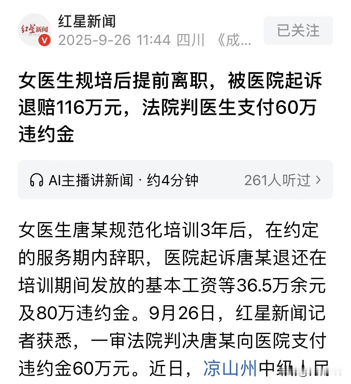 四川凉山,一女医生表现优异,被医院送去参加规培,作为回报,女医生培训完必须回医院工作8年,没成想,规培刚结束没几天,女医生就向医院提出离职,医院直接拿出双方当初签的协议,把女医生告上法庭,要求她返还3年期间照发的36.5万工资,并索赔80万违约金,法院判女医生赔60万,她觉得不合理,直接上诉,法院二审这样判了。 2020年8月,女医生唐某因为在工作中表现出色,被医院送去参加一个非常重要的医生培训,叫做“住院医师规范化培训”,地点在四川大学的一家附属医院,专门学麻醉。 培训为期3年,从2020年8月底到2023年8月底。 医院在这3年里,也没让唐医生白干。他们照常给唐医生发基本工资、绩效工资,还给她交着养老保险这些社保费用。 算下来,3年时间医院在她身上投入了36万5千多块钱。唐医生心里也清楚,天下没有免费的午餐。 双方签了一份协议,协议里表明了,她参加的这个培训,是用人单位出钱出力培养她。作为回报,唐医生培训结束后,必须回到这家医院工作,并且要干满至少8年。 协议还特别强调,如果唐医生没干满8年就想走人,那她得把医院在她培训期间花的所有钱,就是那36万多都退回去。 而且,每少干一年,还得额外赔给医院10万块钱违约金。这两笔钱要是没结清,医院有权不帮她办理离职和医生资格变更这些必要的手续,这些都是她如果反悔要承受的代价。 唐医生当时签了字,算是接受了这些条件。 培训的日子按计划进行。2023年8月28日,唐医生顺利完成学业,结束了3年的规培学习。 然而,回到原医院仅仅一周,也就是同年9月4日,唐医生就向医院正式提交了辞职报告。 这距离协议要求的8年服务期,显然差得太远了。 医院当然不同意。协议签了,钱也花了,结果人刚学成就想跑?医院觉得唐医生这是明摆着违约。 于是,他们不同意给唐医生办离职手续。唐医生这边觉得不合理,为了能顺利离开,她先是去申请劳动仲裁,但没成功。 到了2024年8月,她干脆把医院告上了法庭,最大的诉求就是要求医院放她走,给她办离职手续。 在这件事情上,法院支持了唐医生离职的请求。 法院判决医院必须为唐医生出具解除聘用关系的证明,并且要配合办理人事档案转移等各种离职该办的手续。 这个判决最终生效了,唐医生在程序上获得了自由身。 但是,离职归离职,违约的责任可没跑掉。 医院这边也没闲着。他们同样走了法律途径。医院记得清清楚楚那份《规培协议书》里的条款。 他们向劳动人事争议仲裁委员会提出仲裁申请,核心就2条:第一,确认唐医生提前辞职就是违约。第二,要求唐医生把培训期间拿的36万5千多块钱工资福利都吐回来,同时按协议支付80万违约金,按少服务8年计算。 不过,仲裁这条路没走通,仲裁委没有受理医院的申请。 医院没放弃,紧接着就把唐医生起诉到了法院。 那么,从法律角度,怎么看待这件事? 《劳动合同法》第22条规定:用人单位为劳动者提供专项培训费用,对其进行专业技术培训的,可以与该劳动者订立协议,约定服务期。劳动者违反服务期约定的,应当按照约定向用人单位支付违约金。违约金的数额不得超过用人单位提供的培训费用。用人单位要求劳动者支付的违约金不得超过服务期尚未履行部分所应分摊的培训费用。 医院为唐某提供了麻醉学规培的专项培训,并承担了培训期间的各项费用共计36.5万,符合“提供专项培训费用”的法定情形。 双方签订的协议明确约定服务期为8年,唐某在规培结束次月即辞职,实际仅履行了1个月服务期,剩余服务期达7年11个月。 根据法条,唐某需支付违约金,但金额不得超过医院实际支出的培训费用也就是36.5万元以及未履行服务期对应的分摊费用。 法院审理后,并没有支持医院要求唐医生退还那36万5千多块钱工资的请求。 法官认为,这笔钱是唐医生在培训期间实际“工作”或者说“接受培训”期间应得的报酬,虽然培训是医院安排的,但让她全额返还不太合理。 然而,违约的事实却是板上钉钉的。合同签了,服务期没满就辞职,这就是违约。关键在于违约金该赔多少? 一审法院没有完全按照协议约定的80万来判。 法院综合考虑了医院的实际损失、唐医生自身违约的过错程度,以及整个事件的情况,最终做了一个酌情处理,也就是判唐医生向医院支付违约金60万元。 这个金额低于协议约定的80万,但远不是个小数目。 唐医生对这个结果不服气。60万对她来说可不是个小负担。她觉得判得太重,于是中级法院提起了上诉,希望能减少赔偿。 然而,到了2025年8月21号,二审法院做出了最终判决:驳回唐医生的上诉,维持一审原判。 也就是说,唐医生还是得赔给医院60万。 对于这件事,你怎么看? 欢迎关注@一案一论