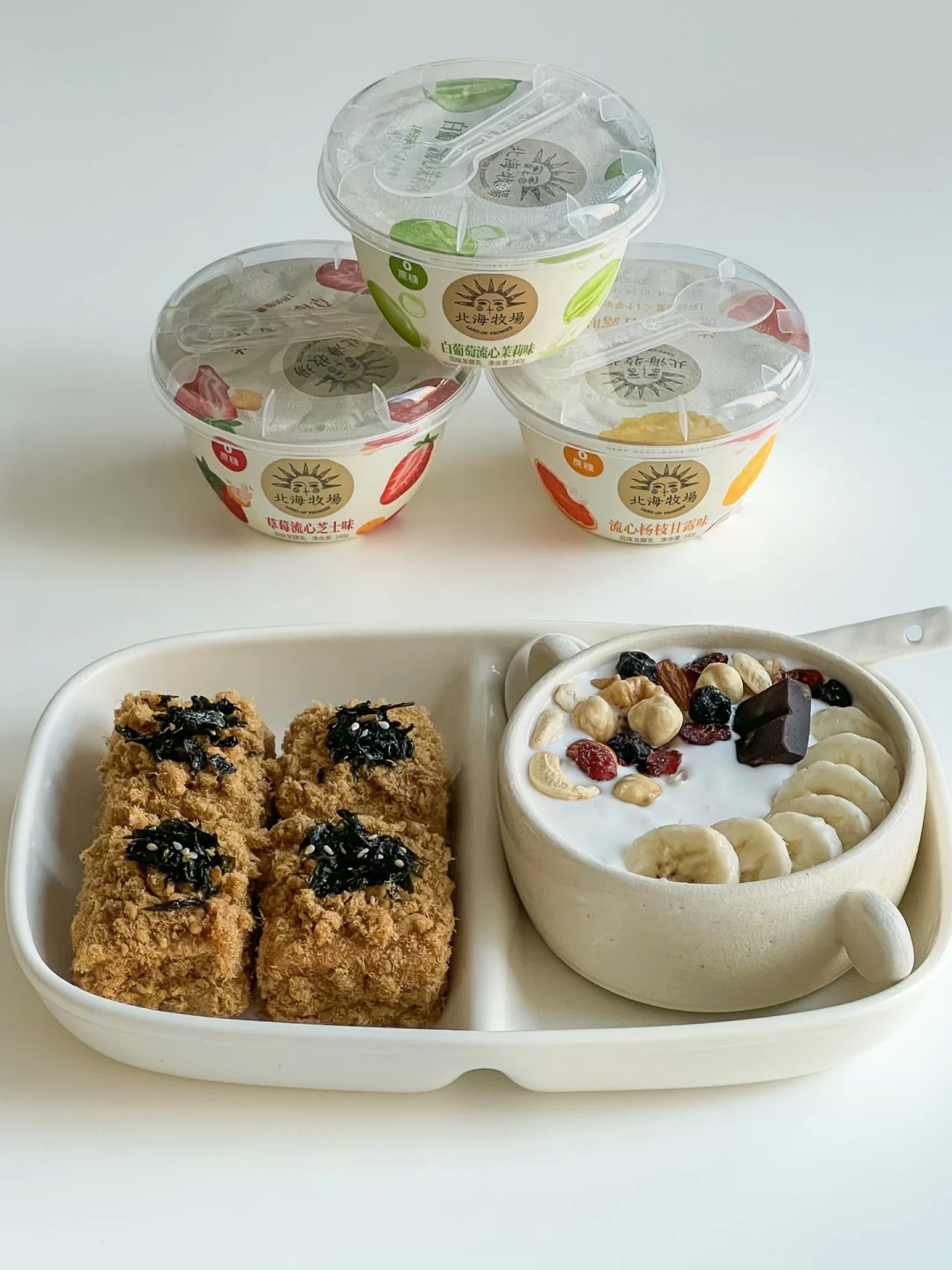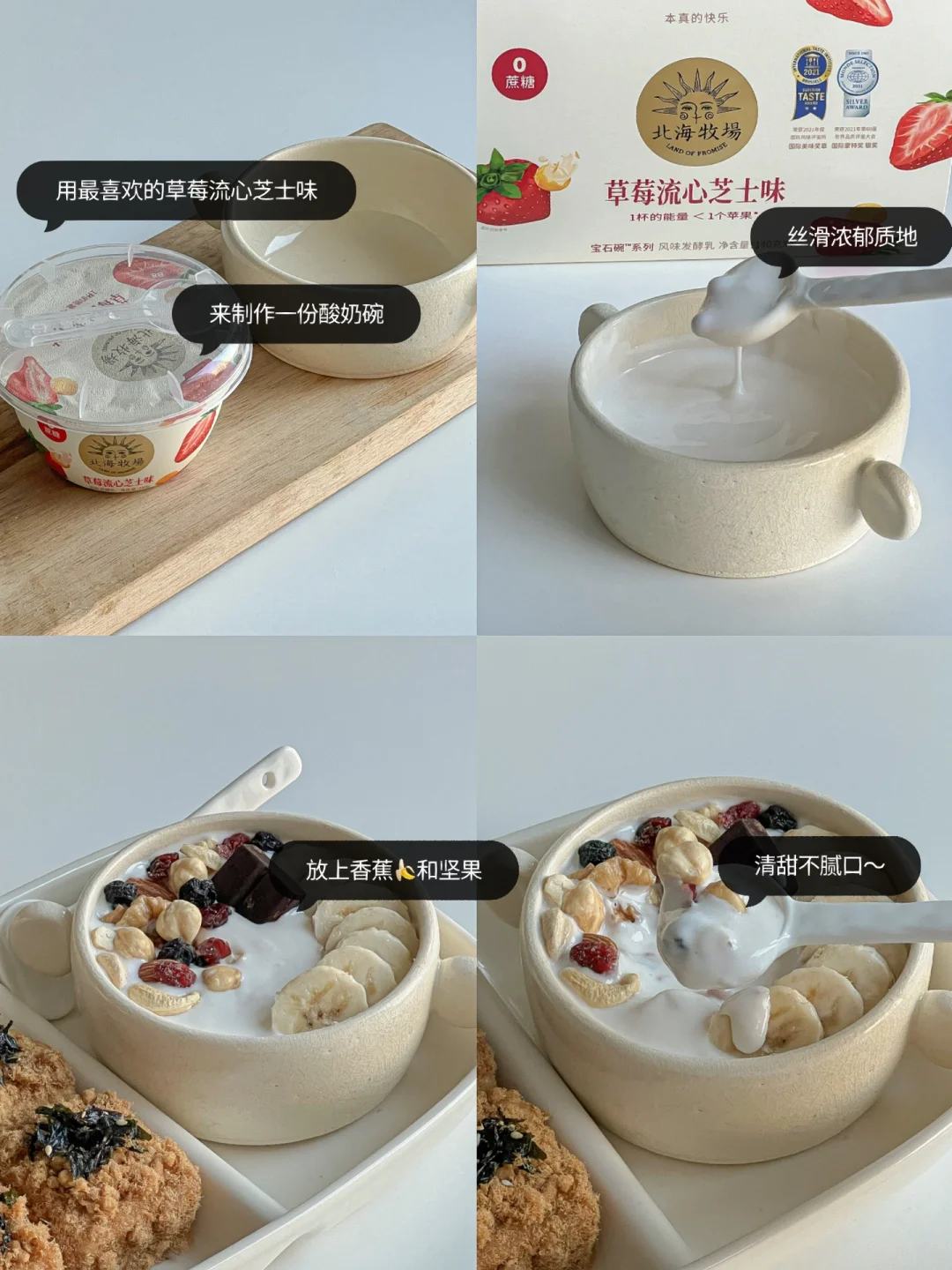水果酸奶碗,就用北海牧场宝石碗酸奶做打底,再码上水果和坚果,这是我一直都很喜欢的宝藏酸奶,三种口味都很好吃,今天用的是草莓流心芝士,浓浓的奶香特别醇厚而且不腻,里面还有很多大颗的草莓果肉,搭配着流心珠珠的芝士爆浆,口感就很nice,轻卡0蔗糖,一杯的能量小于一个苹果,减脂期也可以放心炫!健康解馋,我一口气就炫了三碗!