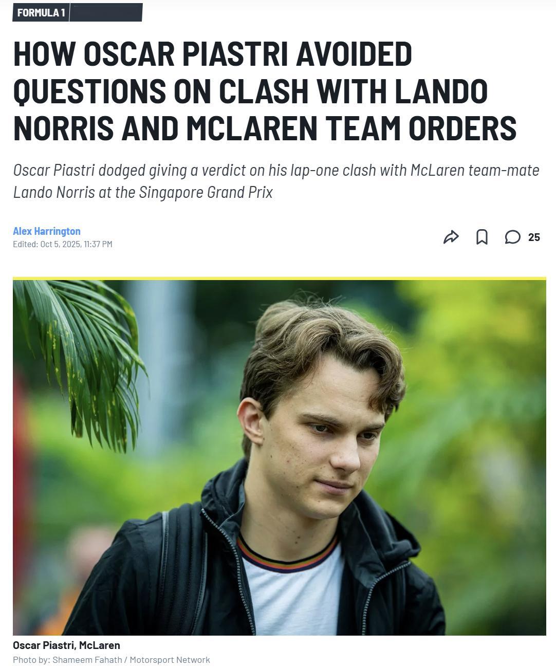 皮亚斯特里在新加坡站正赛后面对天空体育采访时说:“显然这是一场艰难的比赛,艰难的第一圈,不过我还没看回放。我只从车内视角了解情况,所以我会去看看回放。但对整个车队来说,这显然是个美好的夜晚。”