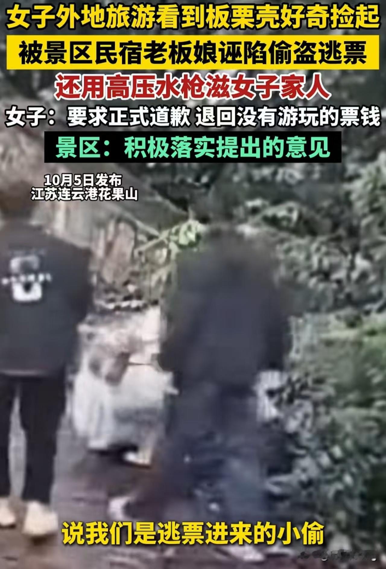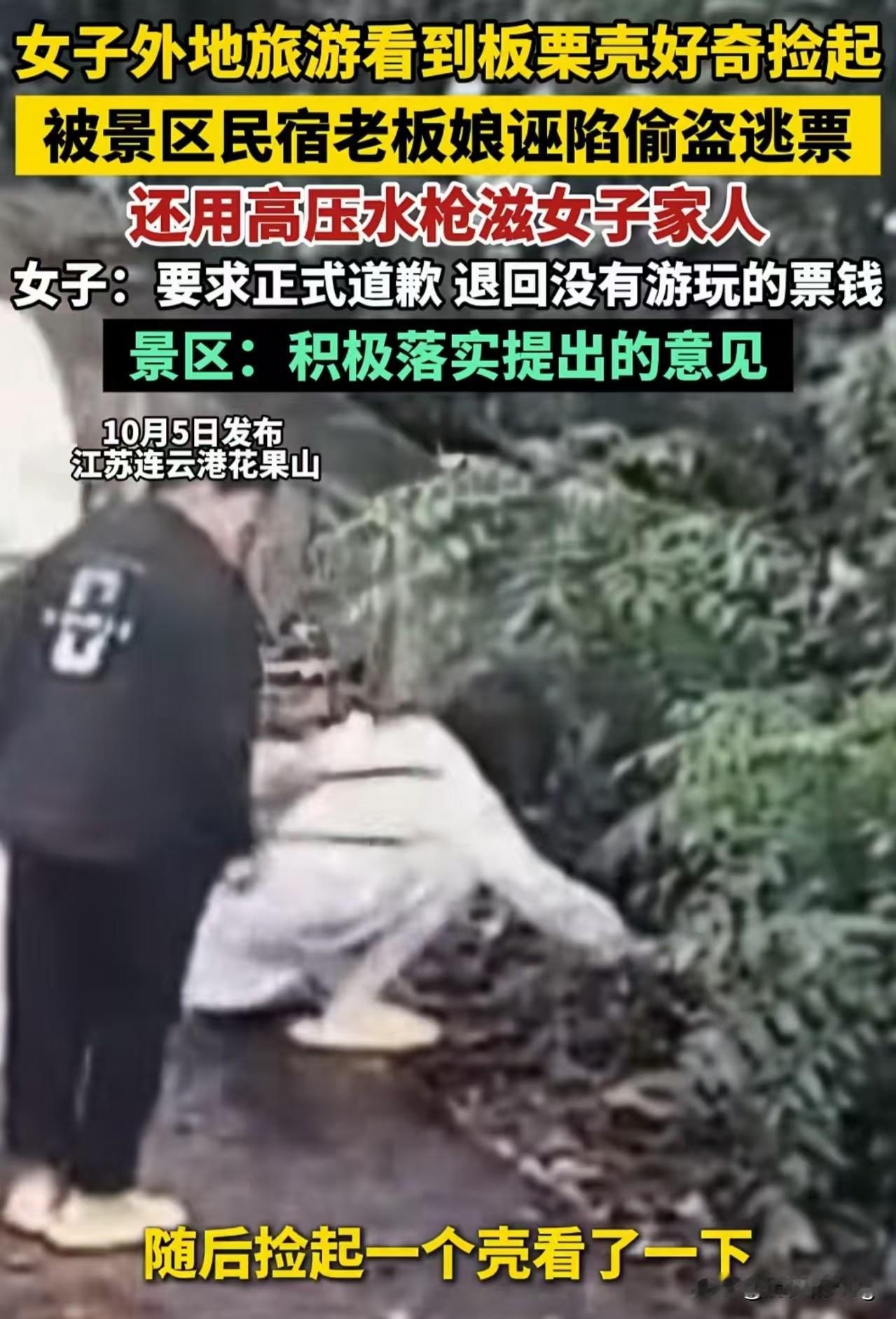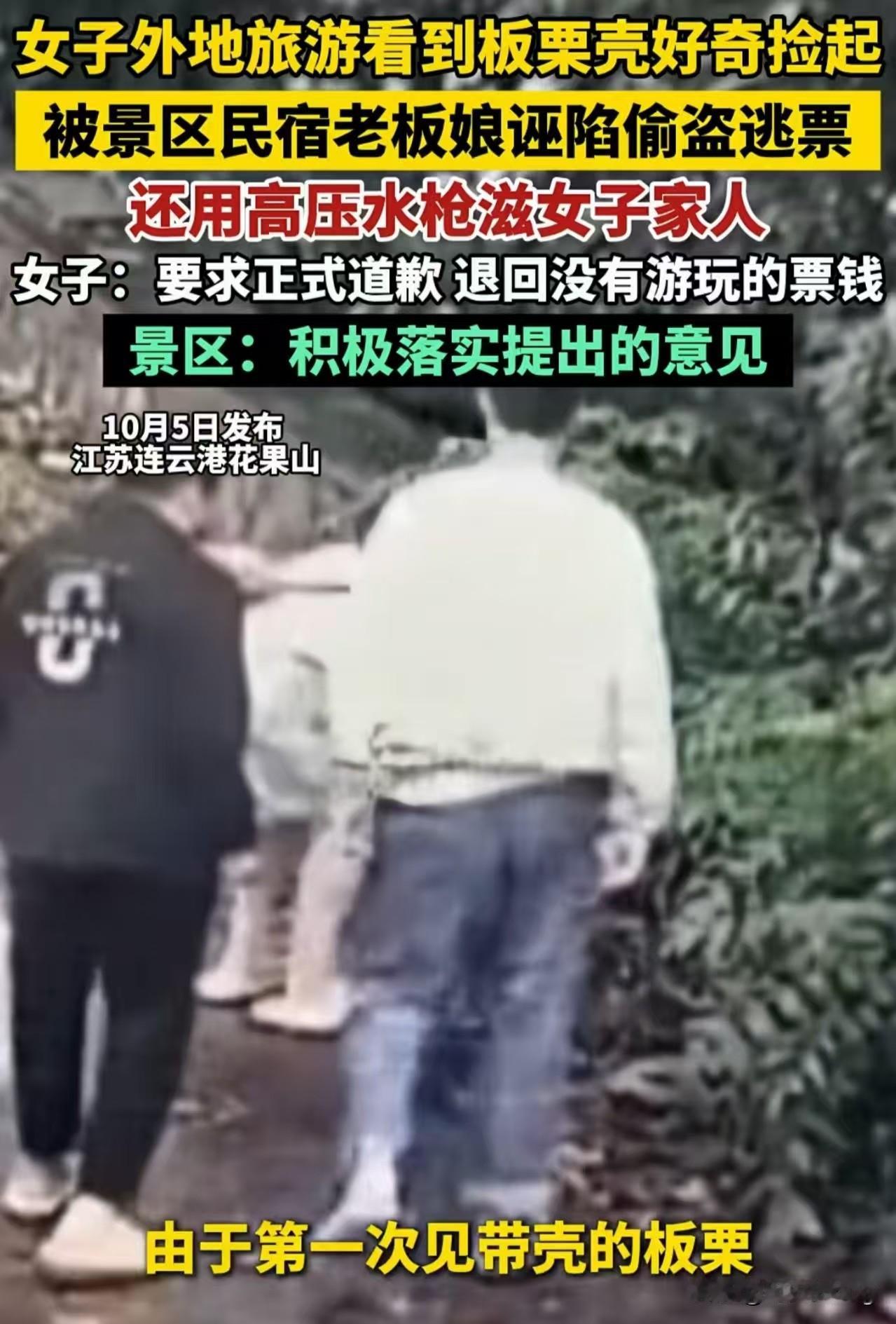 “城巴佬”被黑的最惨的一次! 外地游客去连云港花果山景区游玩,好奇捡起了地上掉落的一个带刺的果实,被景区一家民宿的老板娘诬陷逃票、偷取景区物品。 10月5日,国庆假期已经过去了一大半了,一女子带着她的妈妈和外婆外出游玩,他们听说连云港花果山景区不错,于是来到了这里。 但是接下来发生的一件事,让她们真的后悔选择了这里。 10月5日当天,女子和家人来到景区游玩,走着走着看到路边有几个带着毛的圆滚滚的东西,她们一家人对此十分好奇,于是弯腰把它们捡了起来。 其实这些东西就是山上的板栗,没有脱掉外壳的板栗她们没有见过,她们常年生活在城市里,没有去大山里面待过,她们印象中的板栗就是那种脱过皮、炒好后可以直接吃的板栗。 在山里人眼中再平常不过的东西,在她们一家人的眼中却成了十分稀罕的物件。正是这份好奇,让她们遭了殃。 就在她们把板栗捡起来之后,旁边一家民宿的老板娘看到了这一情形,立马喊住了她们,大声吼着说他们偷盗东西,而且还诬陷他们逃票。老板娘说着就要去报警,于是女子上前和她进行理论。 随后女子的妈妈拿出手机对着老板娘进行拍摄,老板娘看到有人拍自己后,转身拿起了旁边的高压水枪,对着女子妈妈和外婆的脸上开始滋水,随后女子的妈妈和老板娘发生争执和推搡,老板娘直接倒下开始打滚。 就在这时,老板娘的父亲走了过来,他就在景区上班,看到自己的女儿倒在地上,他也拿出手机开始拍视频。随后他打电话叫来了景区的工作人员,让工作人员来查女子和家人的票,结果人家买的都有票。 老板娘这时说自己已经怀孕两个月了,被女子妈妈这样一推腹部受伤了,随后赶来的男老板提出让女子一家人赔偿损失费2000元,但是经过调解之后,女子一家赔偿老板娘300块钱营养费。 有网友说到:“就因为没有选择入住你家的民宿,也不能这样对待景区的游客啊”! 还有网友说到:“以前只听说过乡巴佬,今天算是见识到了什么叫城巴佬,那个带毛的东西就是一个带壳的板栗,在山里属于最常见的东西了”。 外出游玩玩的就是一个开心,遇到这种事确实给人留下了一个不好的印象,女子和家人提出:要求得到正式的道歉,以及退回没有游玩景点的票钱。目前景区负责人表示,正在积极落实该名游客提出的意见。 对此,你怎么看呢? 连云港花果山景区 景区