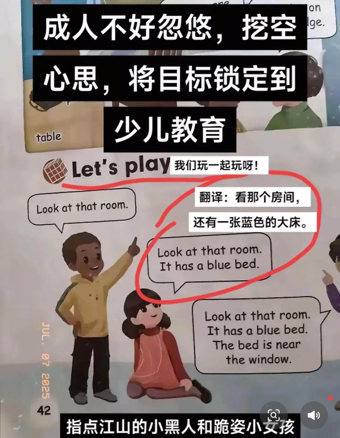 家人们,刷到教材里黄肤色女孩跪着、黑人男孩站着的插图,我真的惊了——这到底是怎么
