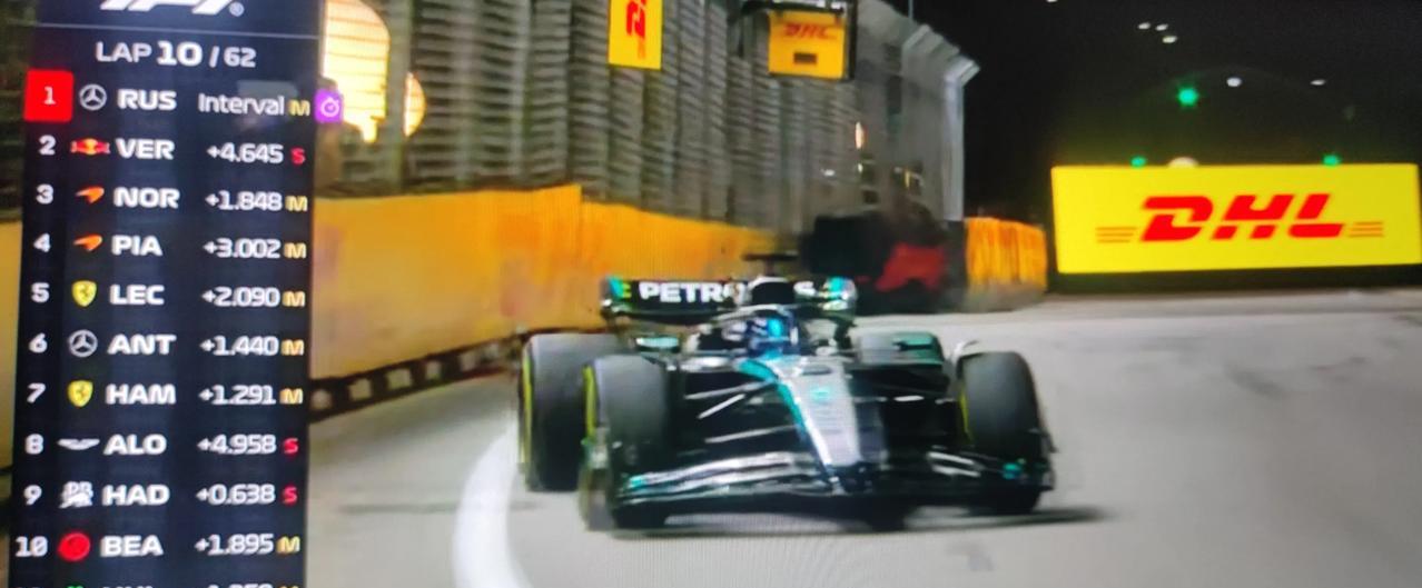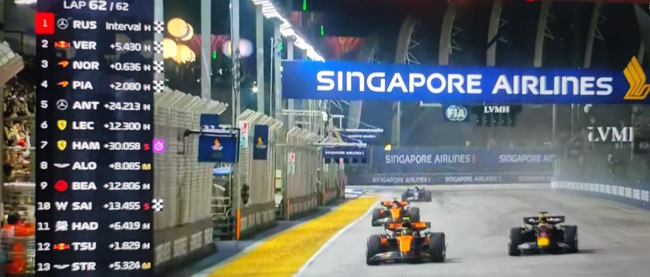 F1新加坡大奖赛正赛,62圈的比赛。狭窄的街道赛道很难超车。 起步阶段,兰多.诺里斯从第5上升到第三,排在拉塞尔、维斯塔潘身后,排在队友皮亚斯.特里身前,不过他的车前翼有点轻微损坏。 阿隆索有个精彩的超车,第10位起步,最终得到第8名。 最终,拉塞尔杆位发车夺得冠军,维斯塔潘第二,诺里斯第三,四五六七依次是:皮亚斯.特里、勒克莱尔、安东内利、汉密尔顿。 迈凯伦车队提前6站拿到车队总冠军。车手前三名的争夺白热化了,诺里斯落后特里23个积分排第2,还有再追! 阿隆索赢得了本场最佳车手评选。