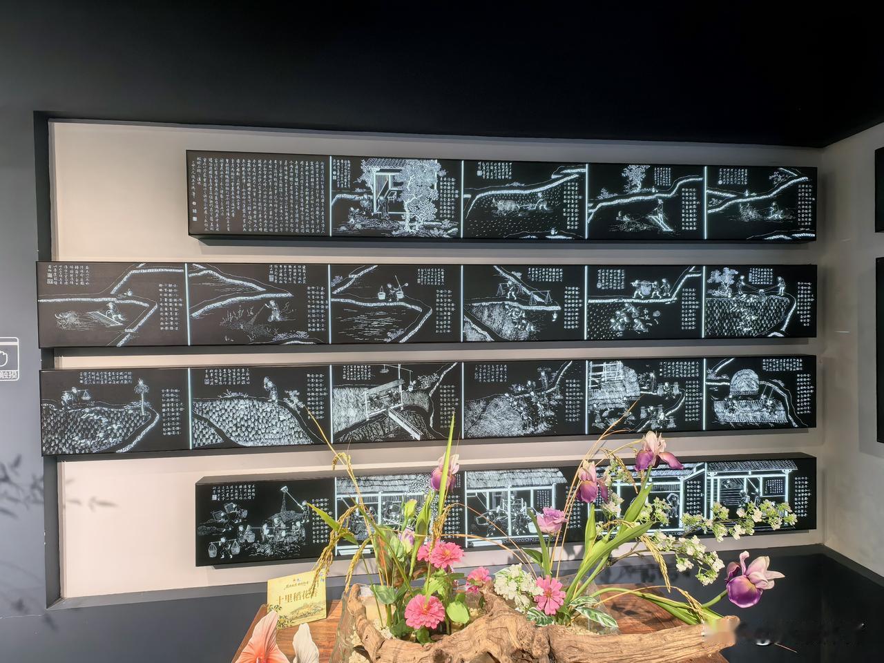 乾隆《耕织图》石刻拓片 乾隆三十四年(1769年),乾隆在元代程柒摹楼琦所作45幅《耕织图》(耕图21幅,织图24幅)每图的空白处,依楼琦诗原韵加题御制诗一首,外加御题识跋等共48幅,命人用阴刻法上石,镶嵌在"耕织图"景区玉河斋左右廊壁上,这标志着清漪园"耕织图"景区完全建成。——拍摄于颐和园耕织图景区