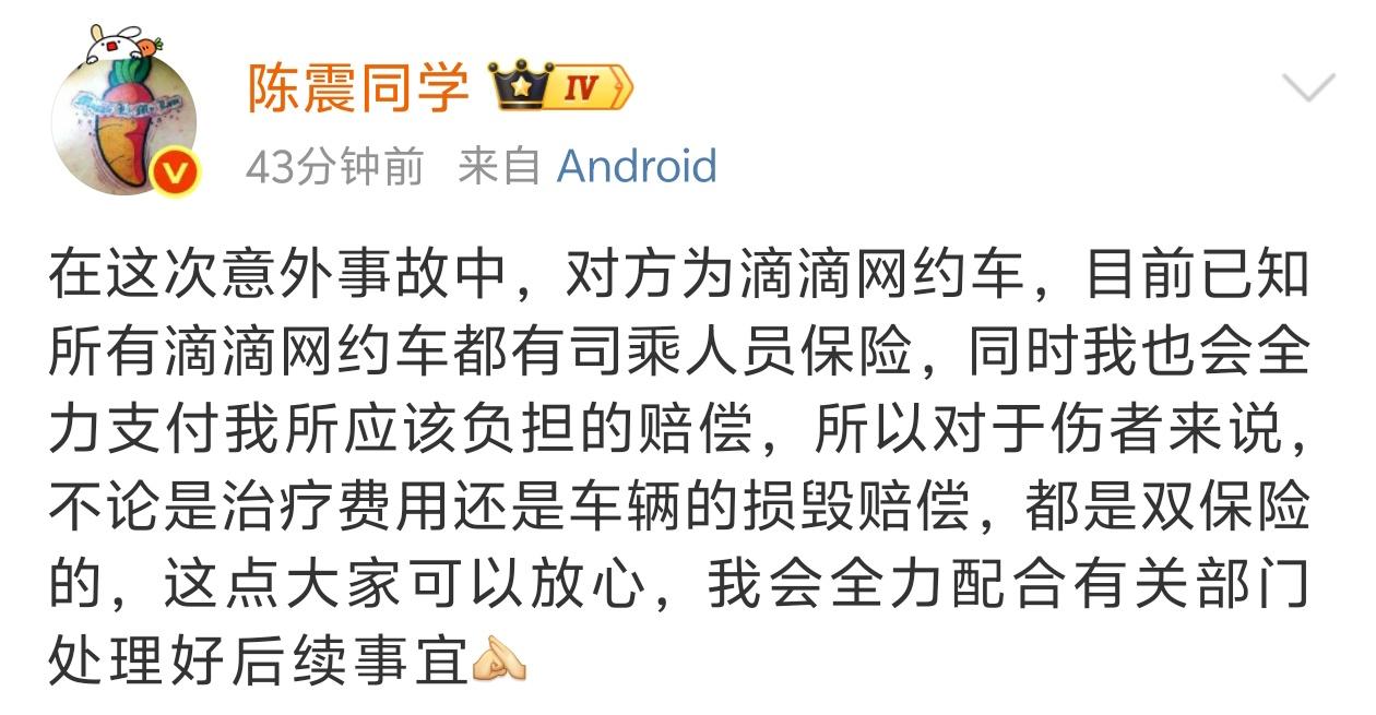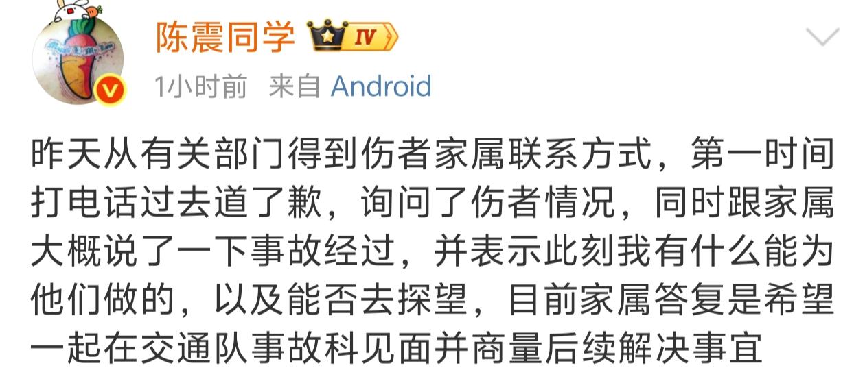 陈震闪灵事件,是每天都有新变化啊。昨天被撞车辆家属发文,今天已经删除了。另外,昨天也有律所介入此事,为被撞车辆家属提供法律服务,律所表示“张启明、戴盛赟律师担任陈某交通肇事案被害人一方的诉讼代理人”。同时陈震在网上再次道歉,表示他的律师会全力配合。 今天,陈震从有关部门得到伤者家属联系方式,并打电话道歉,并询问伤者情况,沟通此事。伤者希望在交通队事故科见面协商解决。 陈震又接着爆料,对方是网约车,有专门的保险。再加上他的赔付,属于双重保险。 事情真是挺复杂的,陈震是不是之前都是在网上道歉,看到对方请了刑辩律师,今天才主动打电话过去了。 再一个,之前不是判定陈震全责吗,和对方网约车的保险有什么关系,不是网约车的责任,网约车保险为什么要赔付,何谈双重保险。 伤者家属把博文删除了,还是想先走协商解决,实在谈不拢可能还是得上庭解决。 后续的发展如何,谁也说不好。【来自懂车帝车友圈】