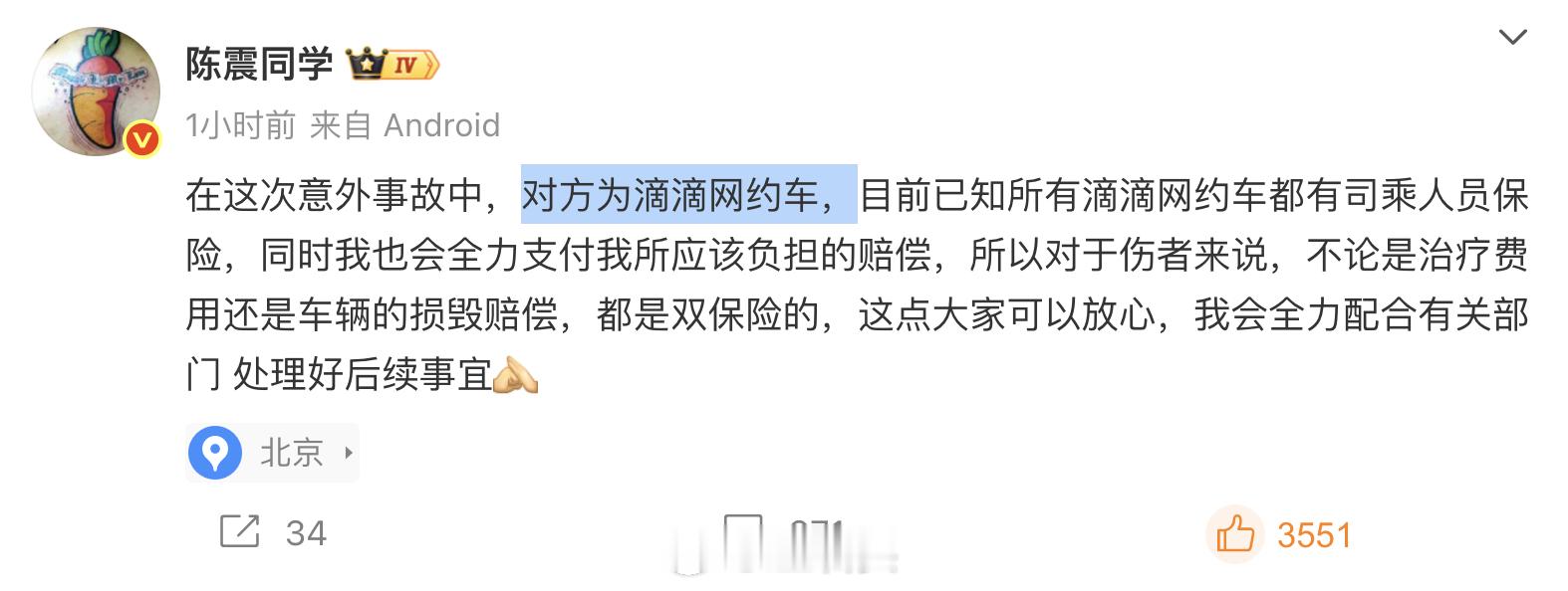 而且陈震就这样把伤者的“网约车司机”身份曝光,表面上是说道歉,实际上却是说的一堆把人创了人家有保险这样的“人话”。