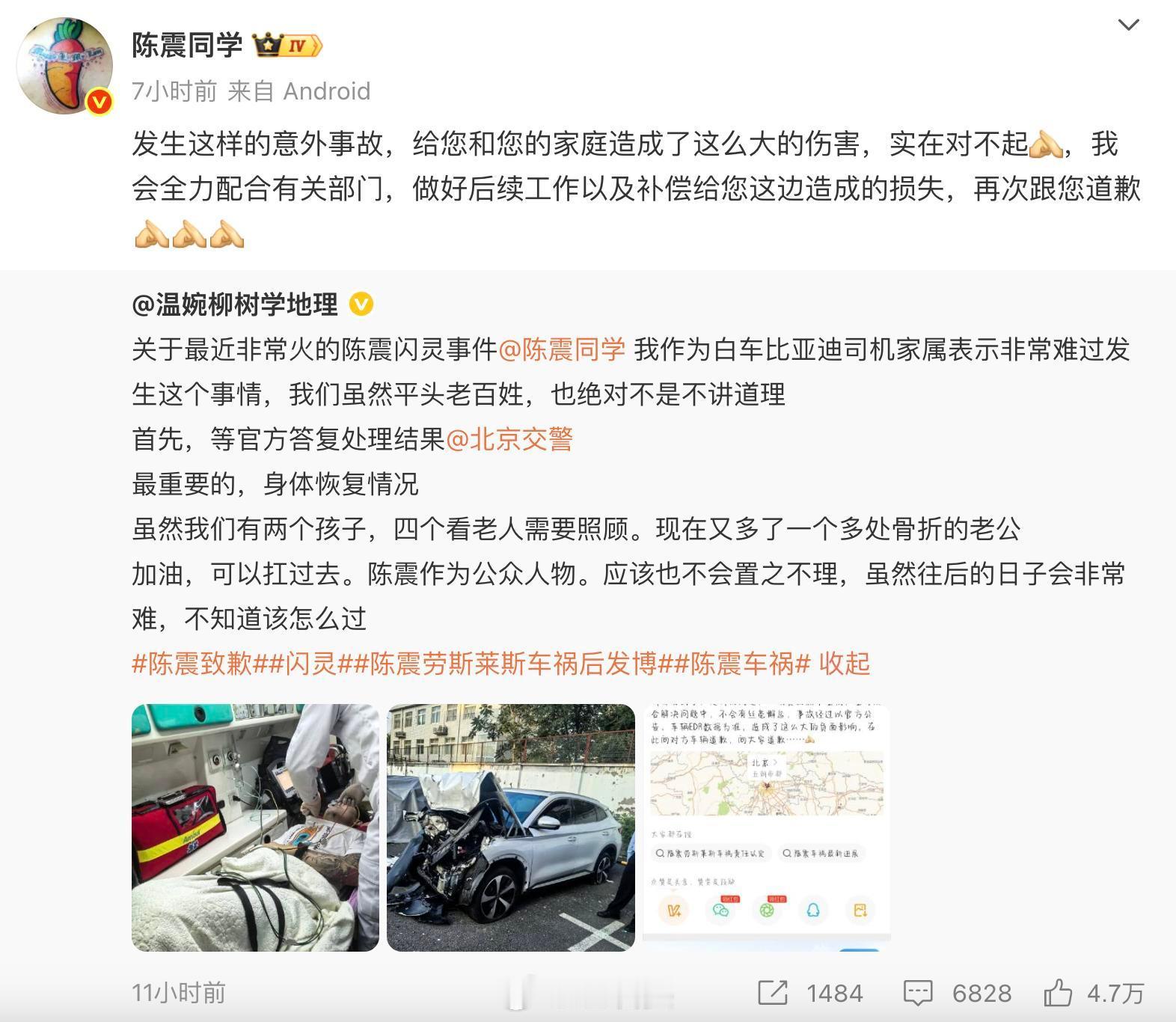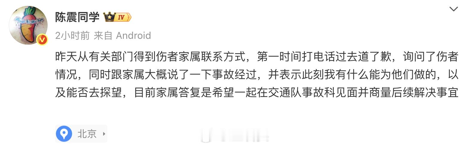 很好奇陈震联系伤者家属后说了啥,估计说了一些威胁之类的话,要不然没道理人家伤者家属就把微博关闭了,把微博删了。