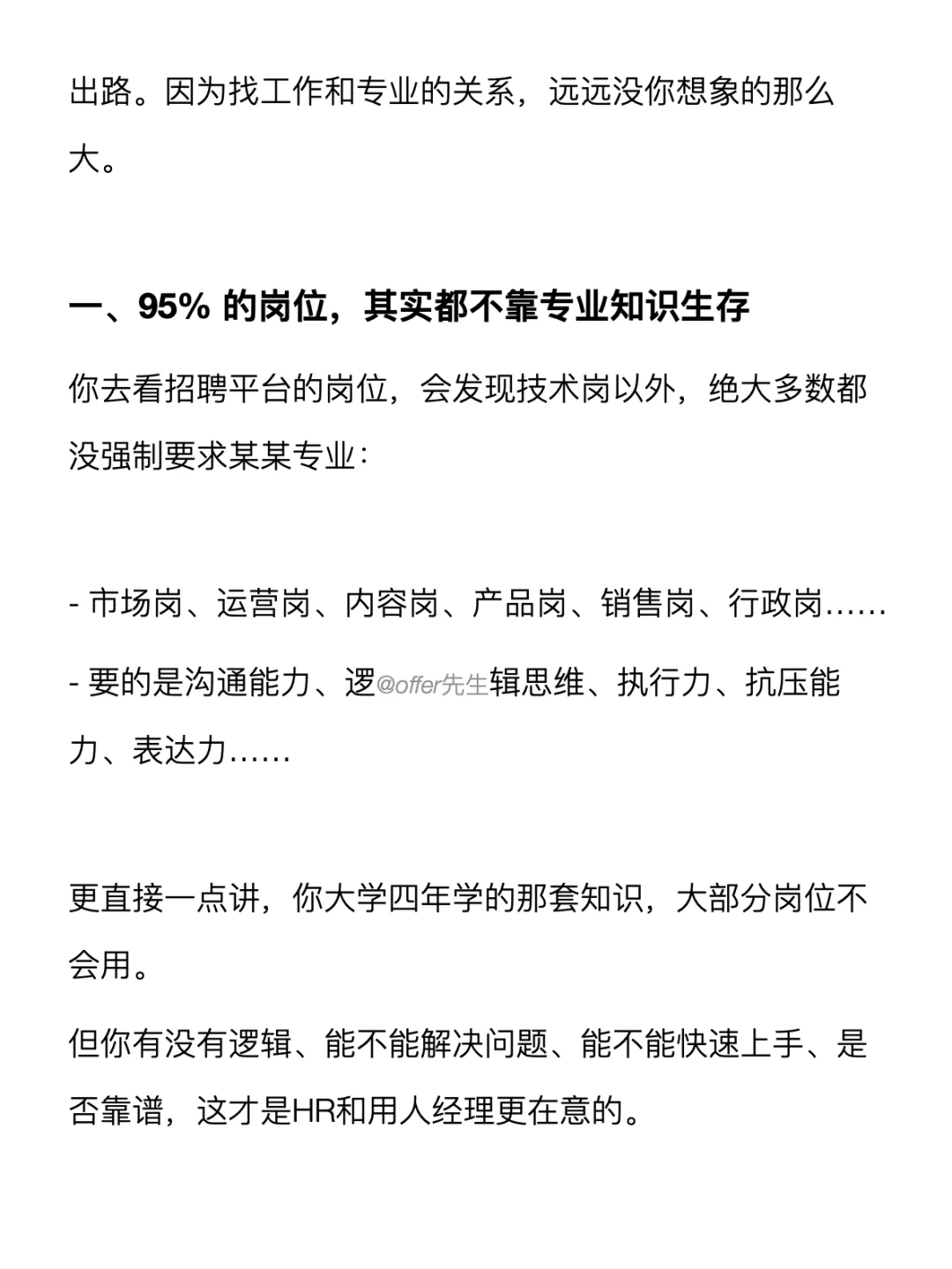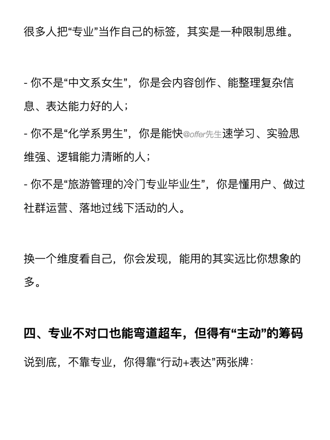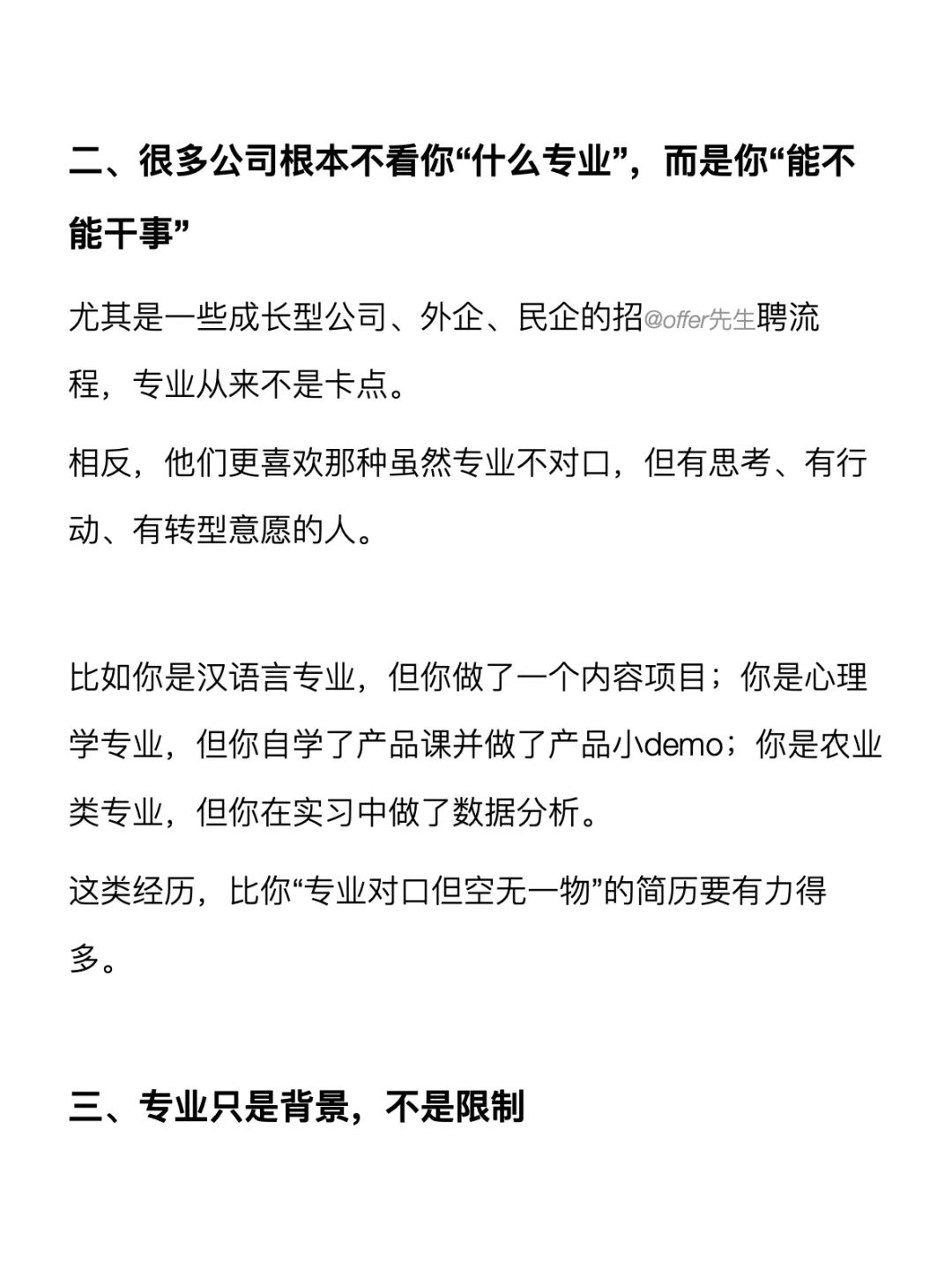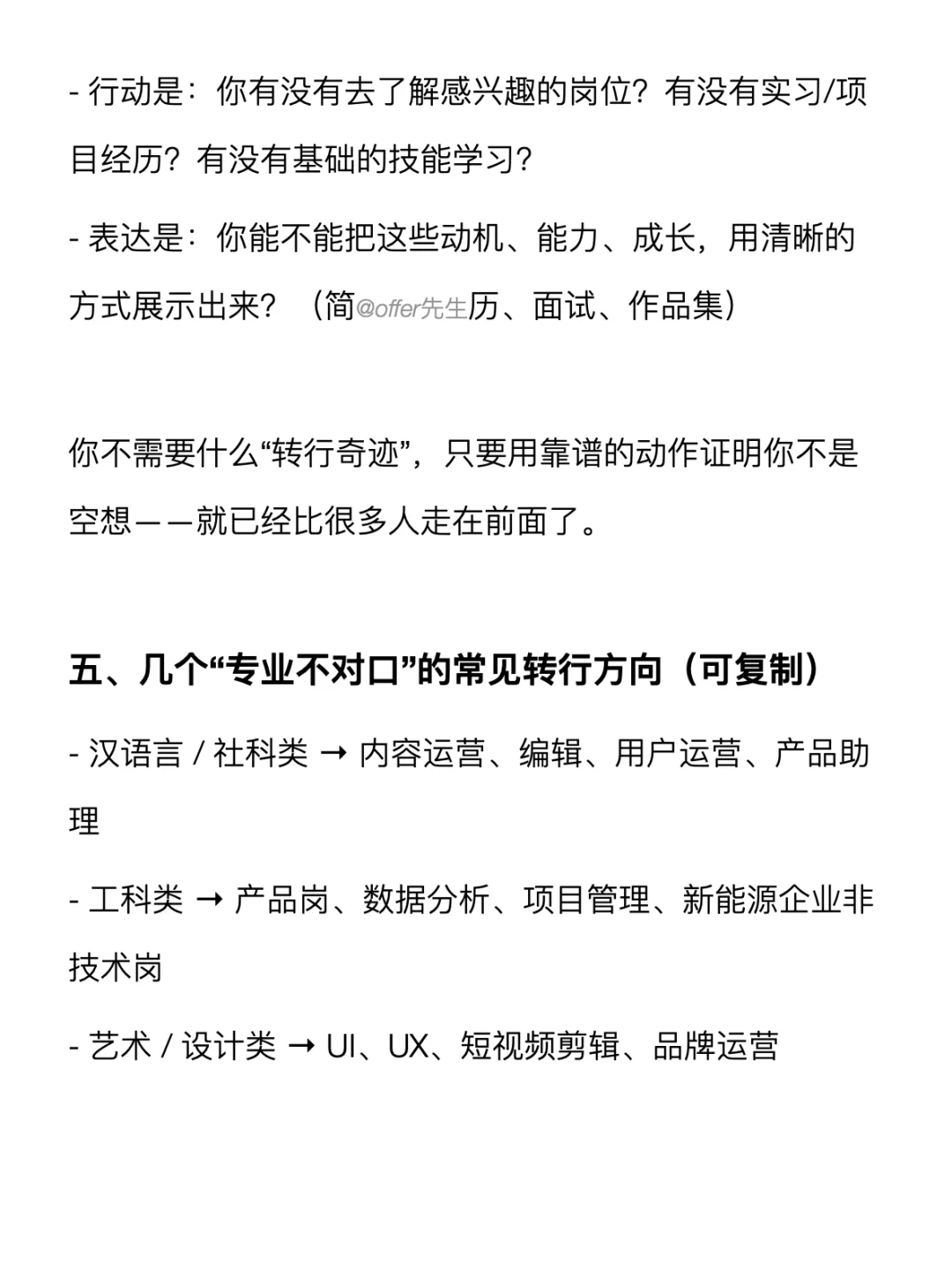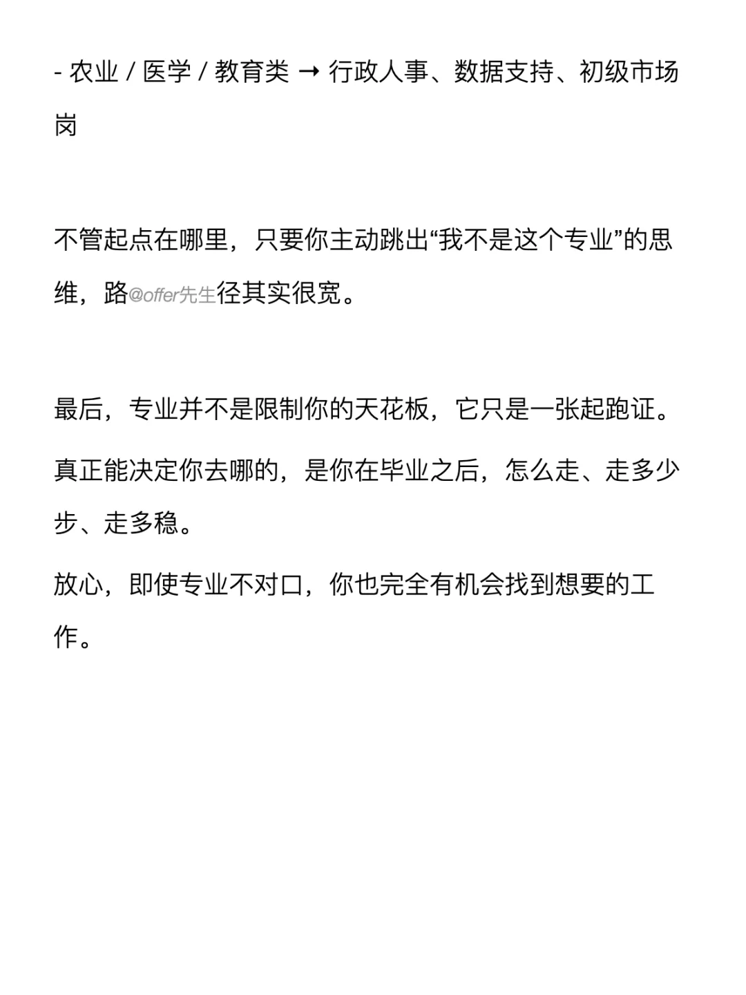 你可能听过一句话:“专业不对口,找不到好工作。”但其实找工作和专业的关系,远远没大家想象的那么大。 . 不管起点在哪里,只要你主动跳出“我不是这个专业”的思维,路径其实很宽。这篇笔记就想和大家分享一些干货,都放在图上了~ . 一个认真分享“找工作”干货的账号。真诚、有料、不说空话,只想用真实经历、具体方法,帮大家少走点弯路 .