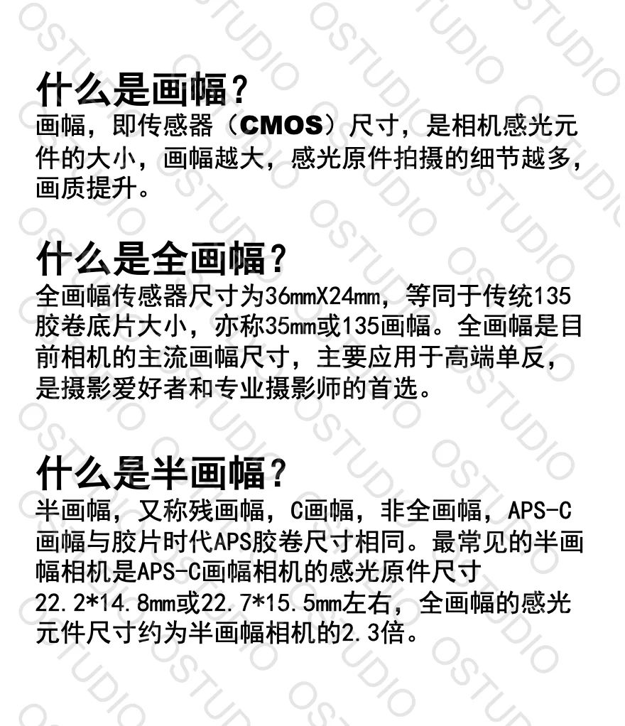 半画幅,又称残画幅,C画幅,非全画幅,APS-C画幅与胶片时代APS胶卷尺寸相同。最常见的半画幅相机是APS-C画幅相机的感光原件尺寸22.2*14.8mm或22.7*15.5mm左右,全画幅的感光元件尺寸约为半画幅相机的2.3倍。