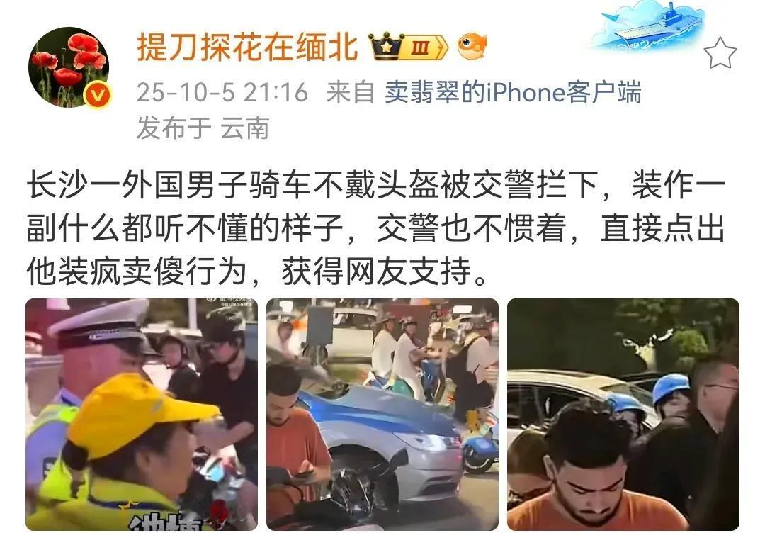 移民部门要负起责任。 (如图所示)在湖南长沙,有外国人不遵守交通规则,还假装不懂中文,装疯卖傻想混过去。 交警不惯他这毛病,值得称赞。 有网友就评论说: 1,外国人,到了中国,并不是高人一等,相反,要更守规矩! 2,应该向美国警察学习!!干净利落,严正执法!!! 3,任何事情都有两个方面,一正一反,如果过度开放,要做好负面应急准备工作, 晒图笔记大赛