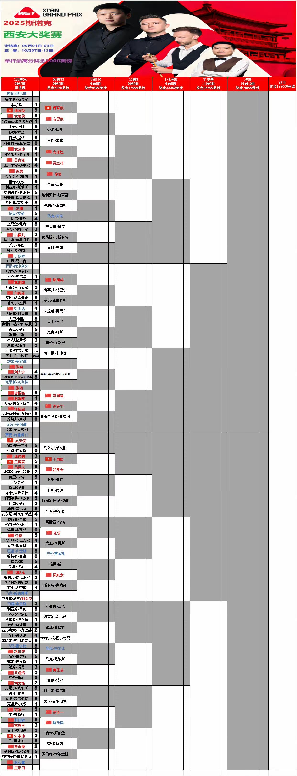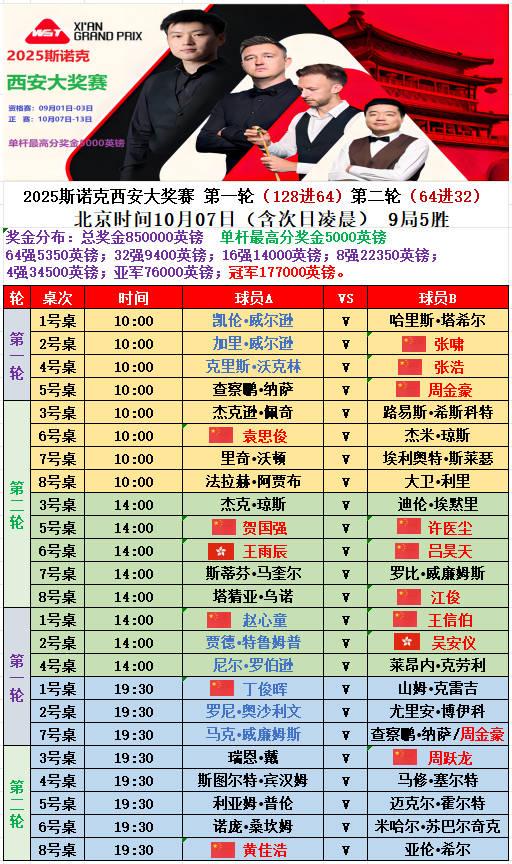 2025斯诺克西安大奖赛来了!比赛日期10.7—10.13,预测谁能夺冠?会有中国球员晋级决赛吗?会打出147吗? 天气这么热,为什么赵心童、特鲁姆普穿外套?霍金斯穿短袖? 图六:赛程安排。