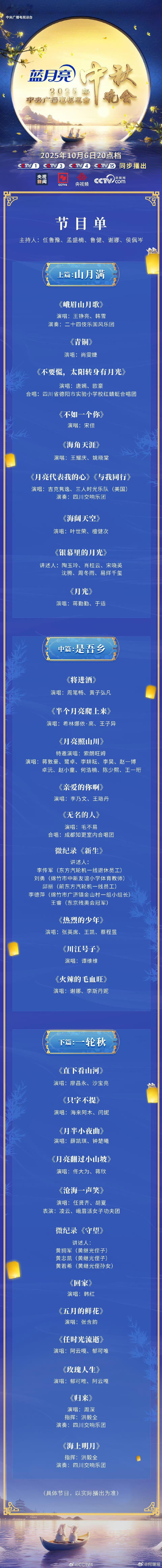 央视中秋晚会央视中秋晚会节目单谢娜央视主持10月6日晚20:00,2025