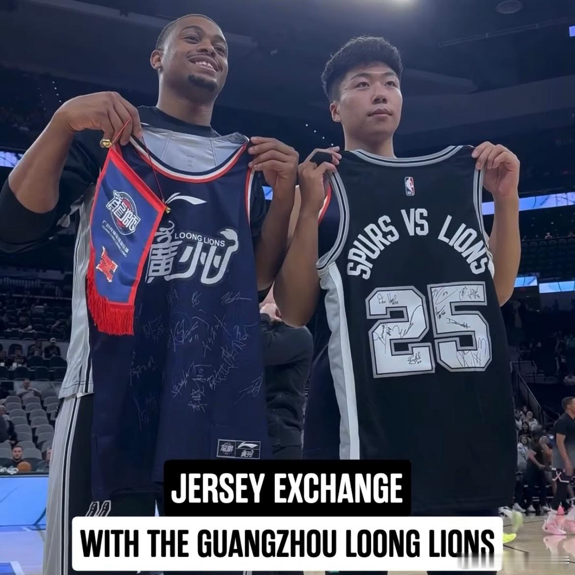 作为马刺、龙狮两支球队的队长,凯尔登-约翰逊与刘颜诚在NBA季前赛开始前互赠球衣。