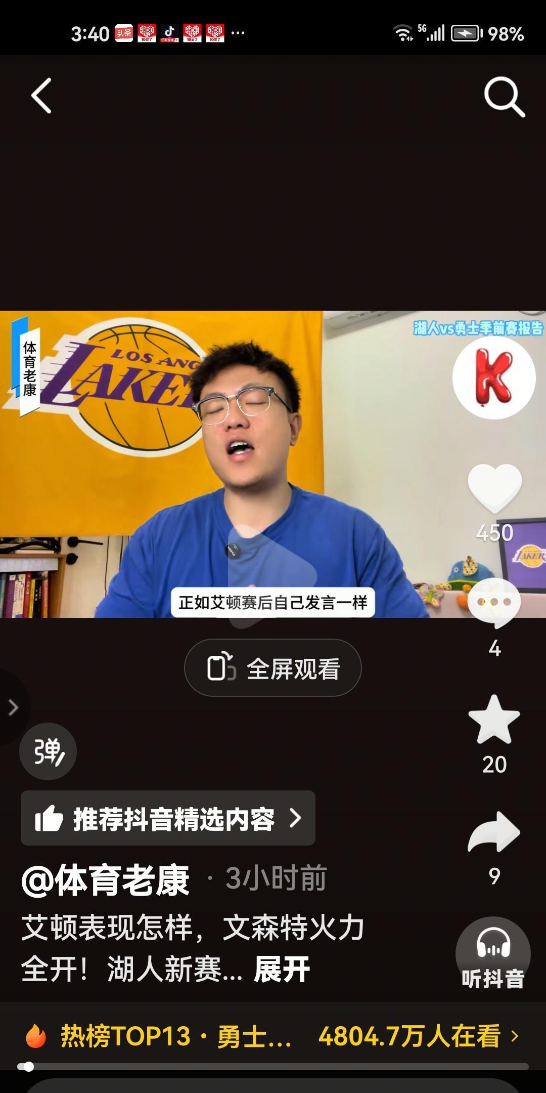 马健:艾顿终究不是湖人队中锋答案! 首场季前赛,“体育老康”对艾顿的评价是两个字